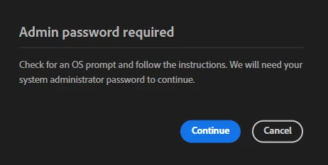 I can't install any apps because it asks me for this "admin password", but it doesn't redirect me to any prompt to enter my password, I press continue and it says "Retry". I tried running CC as administrator and it still does not work. My user account is administrator. I tried uninstalling and reinstalling, I used the adobe cleaner tool. Nothing works. (im on Windows btw)