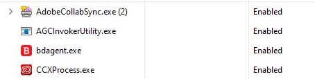 - Every Adobe process is enabled in my start-up apps