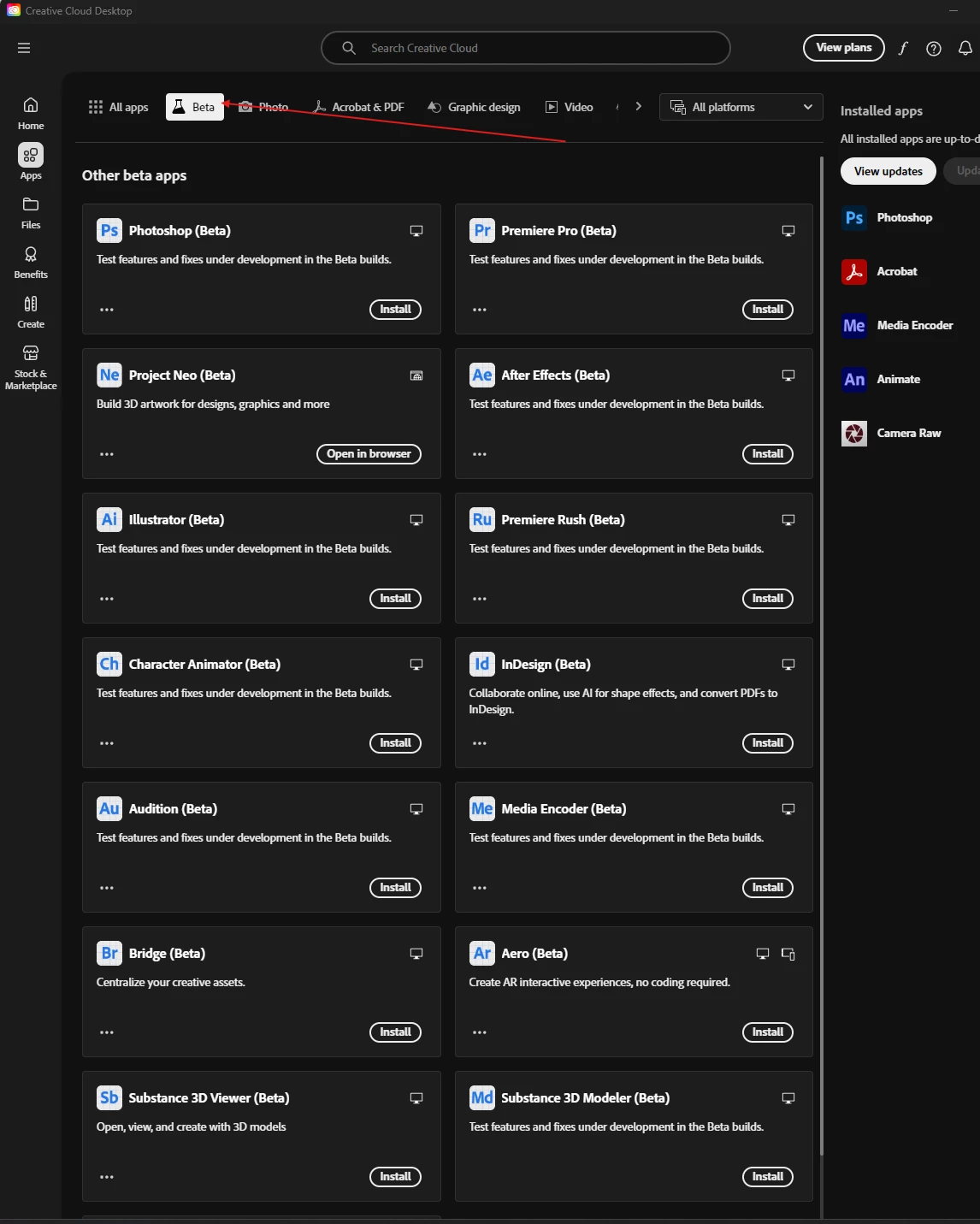 So I installed a few beta apps from Creative Cloud, and now—surprise!—every other beta app has packed its bags and vanished from the "Apps" tab without so much as a goodbye. Just poof, gone. The few I had already installed are still hanging around, probably out of guilt and also working well. How can I make beta apps appear again on creative cloud desktop?