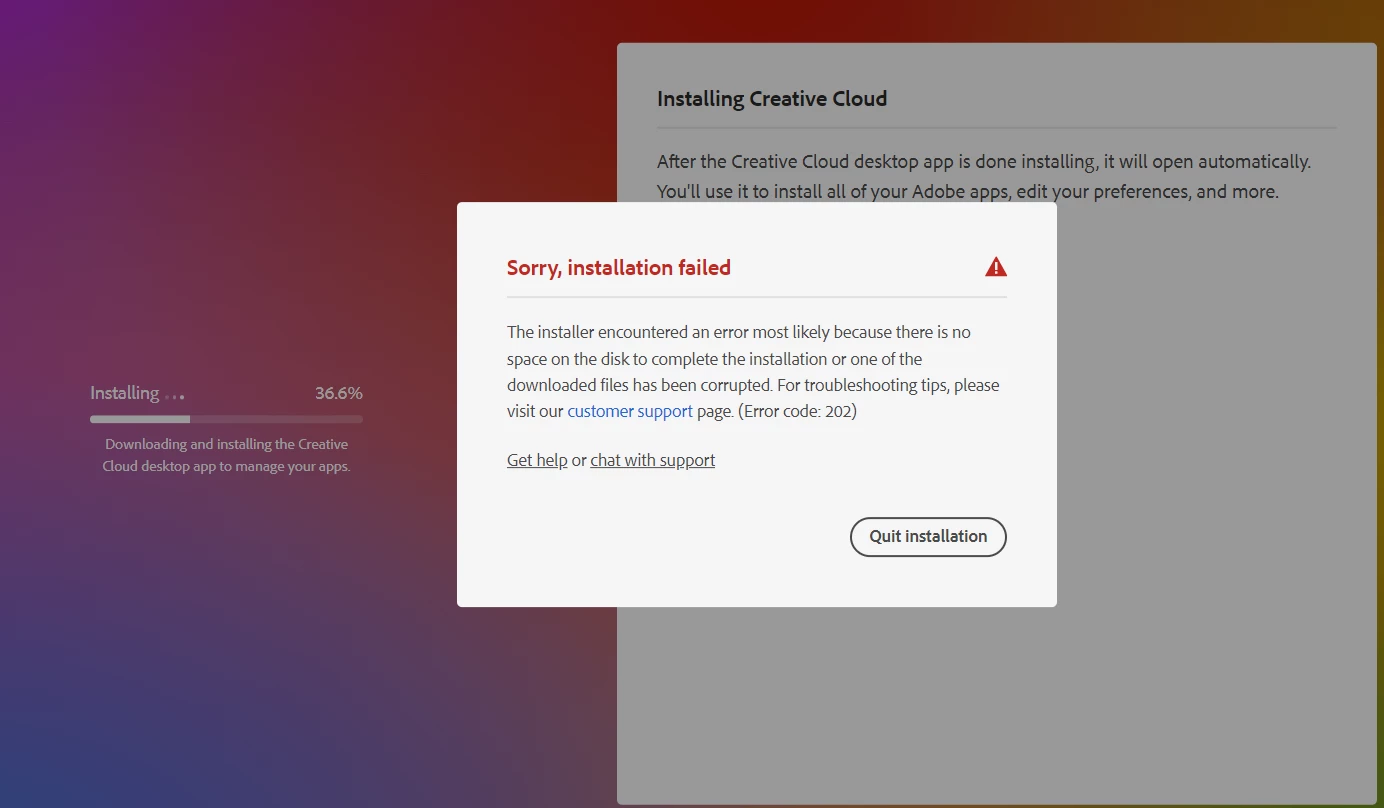 First I couldnt update Creative Cloud because error message 202. I uninstalled it and install again still same error message. I have over 300GB in C drive. I also did Adobe cleaner.