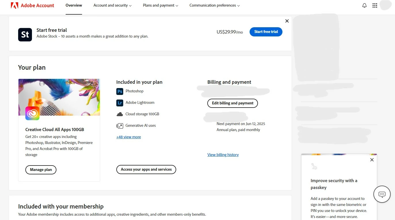 I navigated to "Adobe Account" from the Creative Cloud Desktop and it took me to my account home page showing my plan "Creative Cloud all Apps 100GB", has the correct payment info, shows it was just paid, shows all the apps I SHOULD have access to. I then navigate to "Access your apps and services" from that page and it shows the apps I should have access to as "free trial" or "buy".