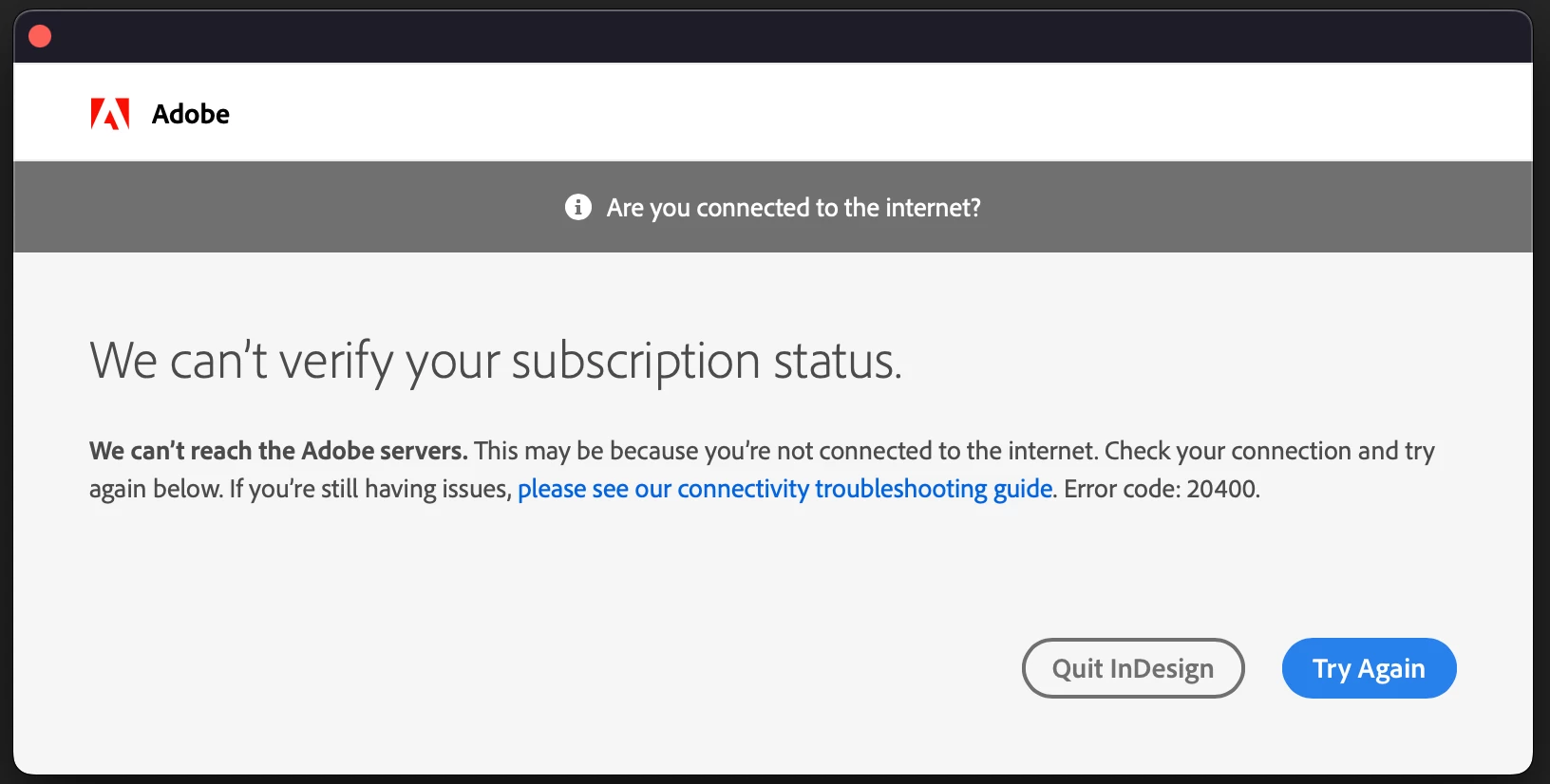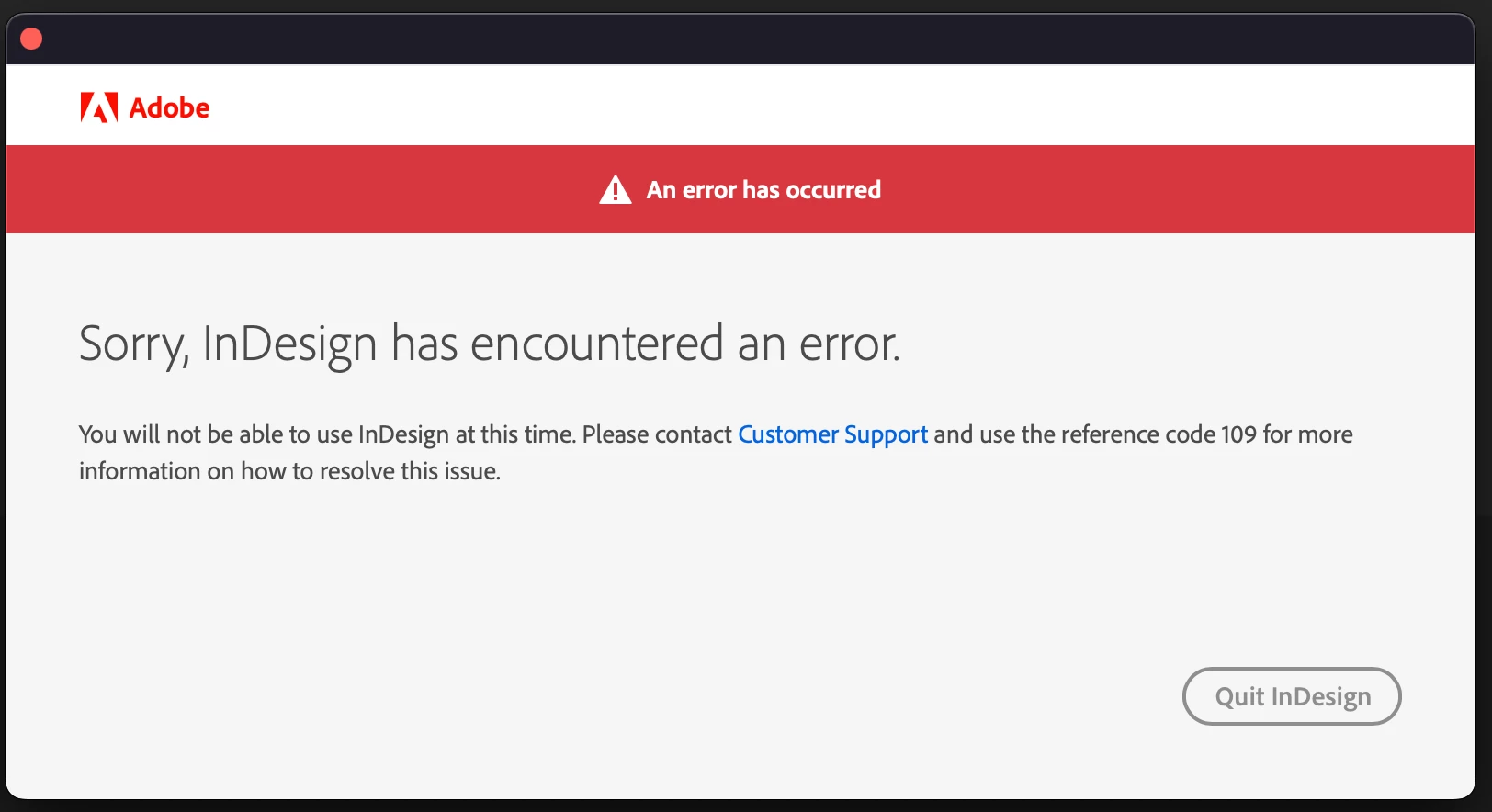 I am currently experiencing an issue with my Creative Cloud applications: I cannot open them, as an error message appears each time. This happens with other applications too but as an example, I am using InDesign.