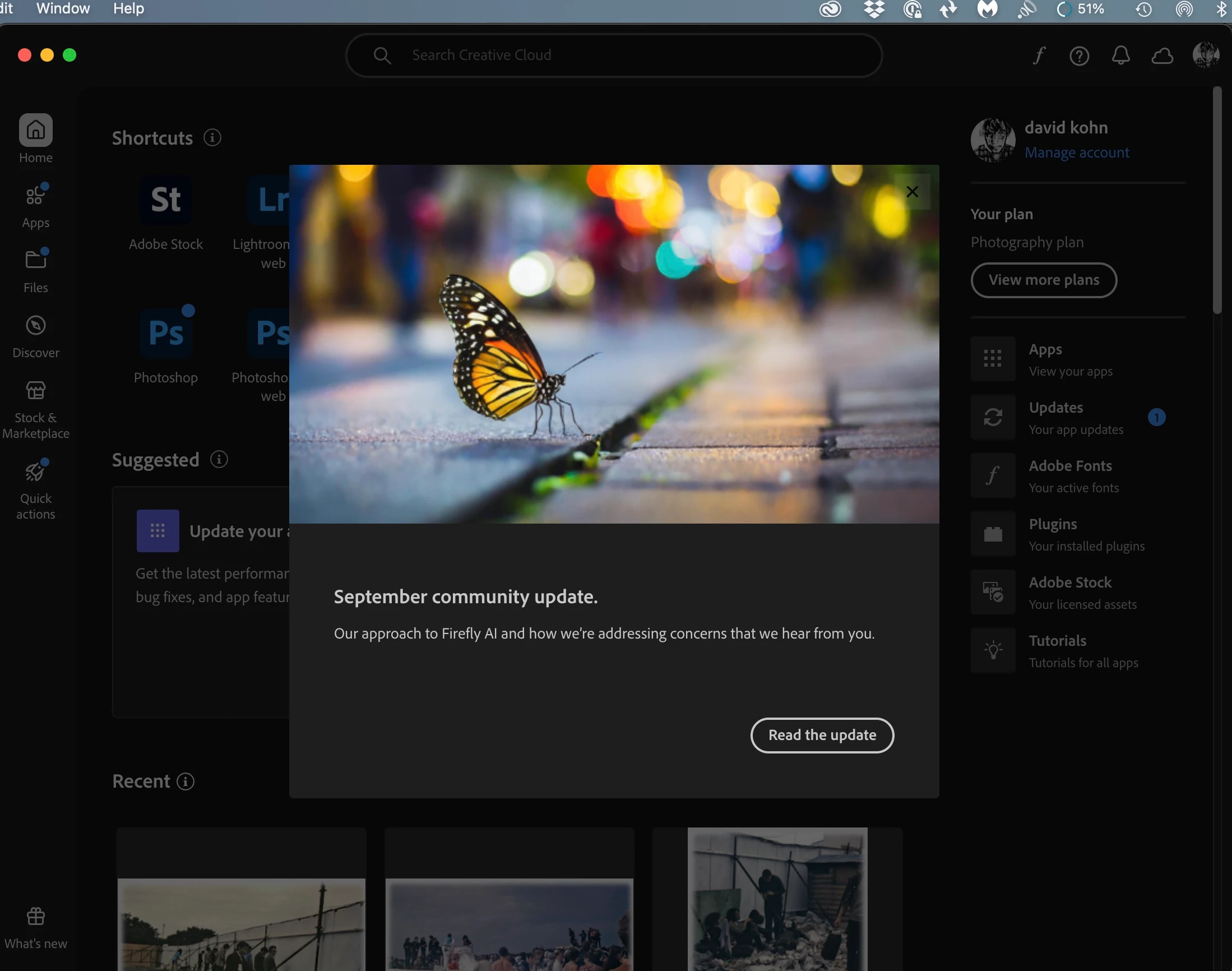 The Creative Cloud app icon disappeared from my Mac menu bar. I went into my Finder and clicked on the CC app, and what came up was what you see in the screenshot below. The app appears to be grayed out and it will not accept any input. As I hover over items, the cursor never changes from the pointer arrow. The only thing I can do in the app is maximize or minimize the window, or to quit the app.