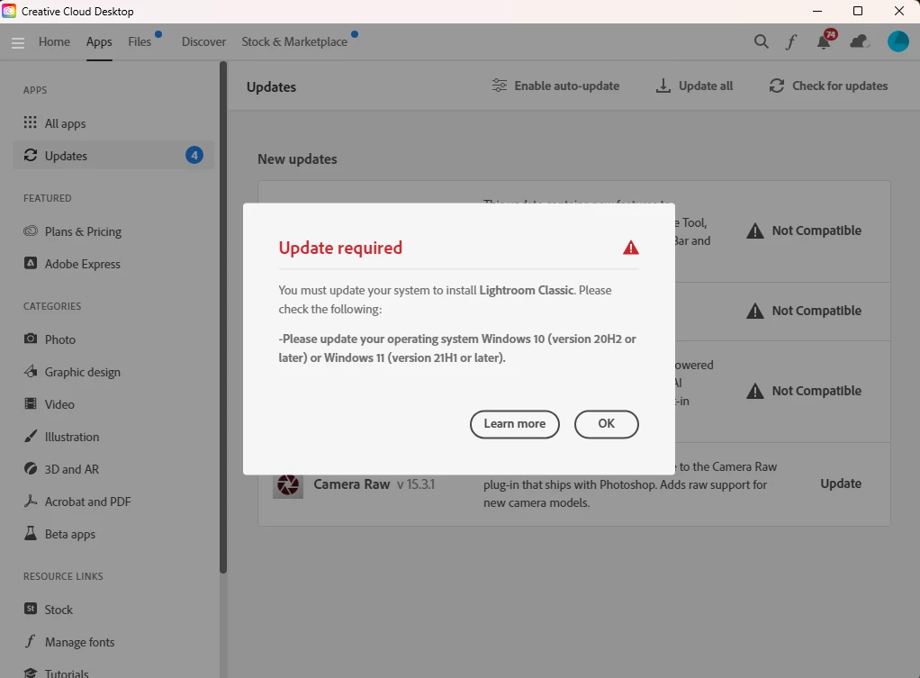 Creative Cloud Desktop reports incorrect windows version preventing updates