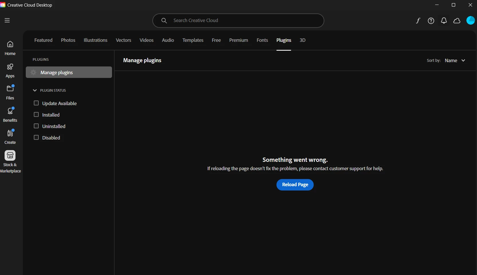 Now, I can no longer install them or use them. The Creative Cloud Desktop app shows an error under Stock & Marketplace → Plugins → Manage plugins, saying: