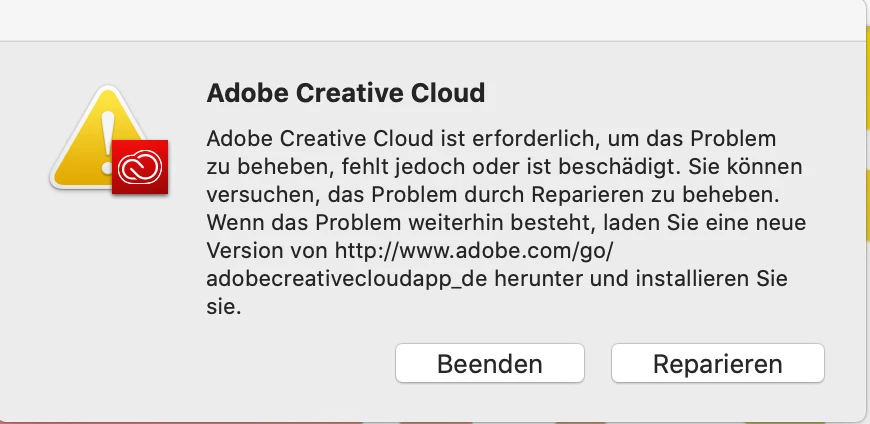 Hallo, nach Neuinstallation von MACOS Catalina erhalte ich beim Neustart eine Adobe Creative cloud Fehlermeldung (siehe Anhang), die sich nicht löschen lässt. Die Reparaturoption funktioniert nicht. Ich seh dann nur noch den farbigen Ball und kann mit dem Notebook nicht mehr arbeiten, weil die Meldung nicht verschwindet und wohl die Reperatur nicht funktioniert. Die Meldung erscheint auch wenn ich das Program Creative Cloud in den Papierkorb lege. Ich kann so meinen gesamten Computer nicht benutzen.