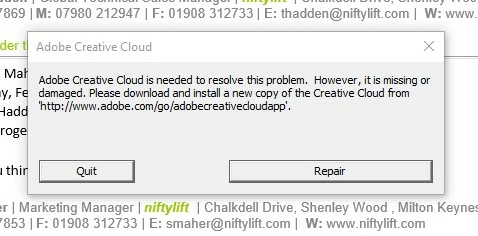 I keep getting the pop up below. i have run the repair multiple times as well as uninstalling (both manually and using Creativ Cloud Cleaner) and reinstalling a fresh download but the pop up is still coming. If anyone has any ideas it would be appreciated.