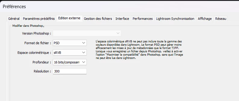 Mon 2e problème est que je ne peux plus sélectionner de logiciel externe dans lightroom Classic.