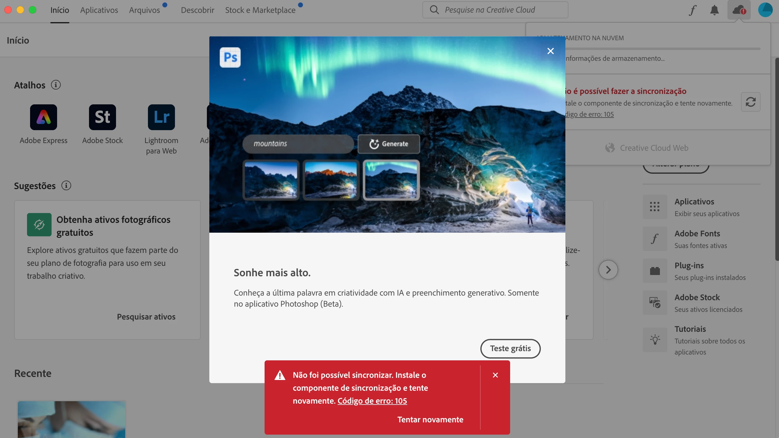 MmilenepereiraParticipantForum|Forum|2 years agoJune 7, 2023AnsweredError 105Forum|Forum|2 years agoJune 7, 20231 reply93 viewsBoa noite, nao consigo soncronizar o Creative Cloud em meu iMac, por error 105. Nao consigo fazer download dos softwares que estou pagando! Ja fiz os 2 passos para correcao e estao OK. O terceiro passo ja nao consigo, sou designer, poxa...App installs and updates