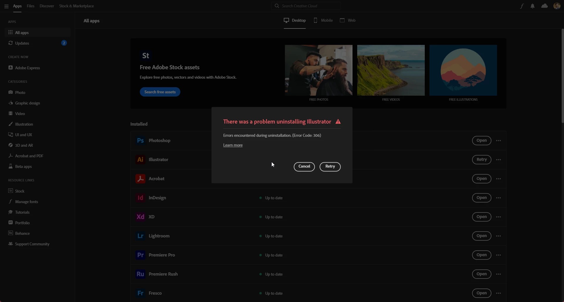 I am encountering this error when trying to update Adobe Illustrator via creative cloud. I've tried to uninstall Illustrator and that too results in an error as shown below.