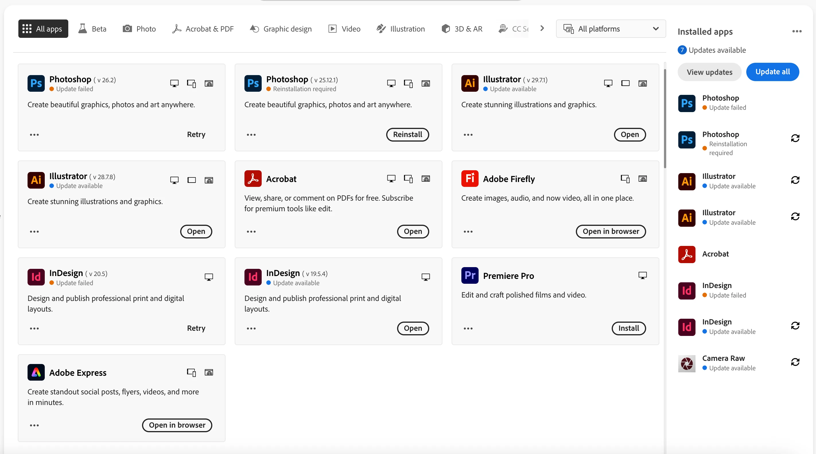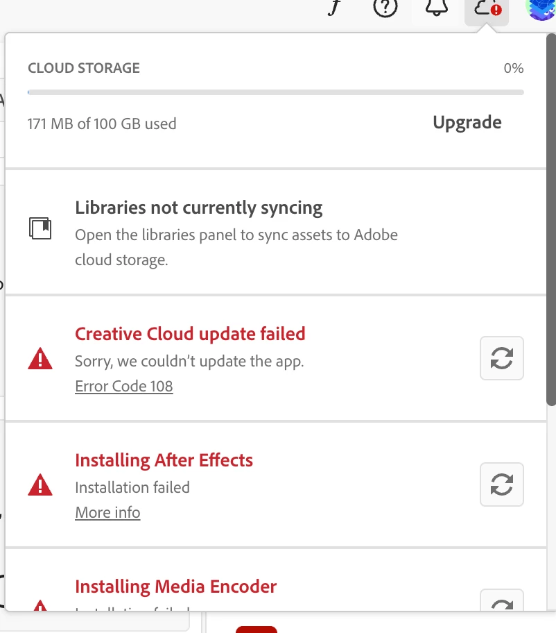 I recently got the newest MacBook Pro M4 and I redownloaded CC and all the apps that I had in my previous Macbook Pro with no issues, or so I thought. I keep getting errors below and read the adobe articles and all requires previous steps that I can solve, such as making sure the library is synched (it wont sync), updating CC (cant update it), etc. I can still access the apps i have downloaded on my Mac, and also have CC installed at my work desktop and everything works fine, but library is not backing up and can't update CC there as well. I am confused on what I can do, I considered manually deleting the apps but the apps are not backed up and am concered I will lose my projects and they are important on my desktop as well. I also cant download new apps on Mac such as AE, that is downloaded on the PC at work. Here are the errors I keep getting error 109 at work PC , error 108 in the Macbook Pro (which I know what it is and make sure I dont have any open app)