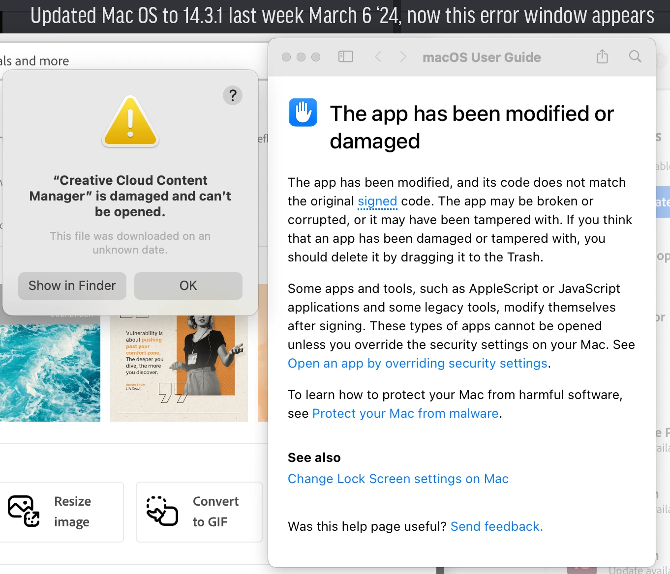 So there must be a conflict between Adobe's current CC Content Manager and the new Sonoma Mac OS. How do I patch this- Is there a place I can find the most recent CC Content Manager app and reinstall it? I've updated my main (Ps Ai, etc) apps but it doesn't fix the alert window popping up 10-20x a day.