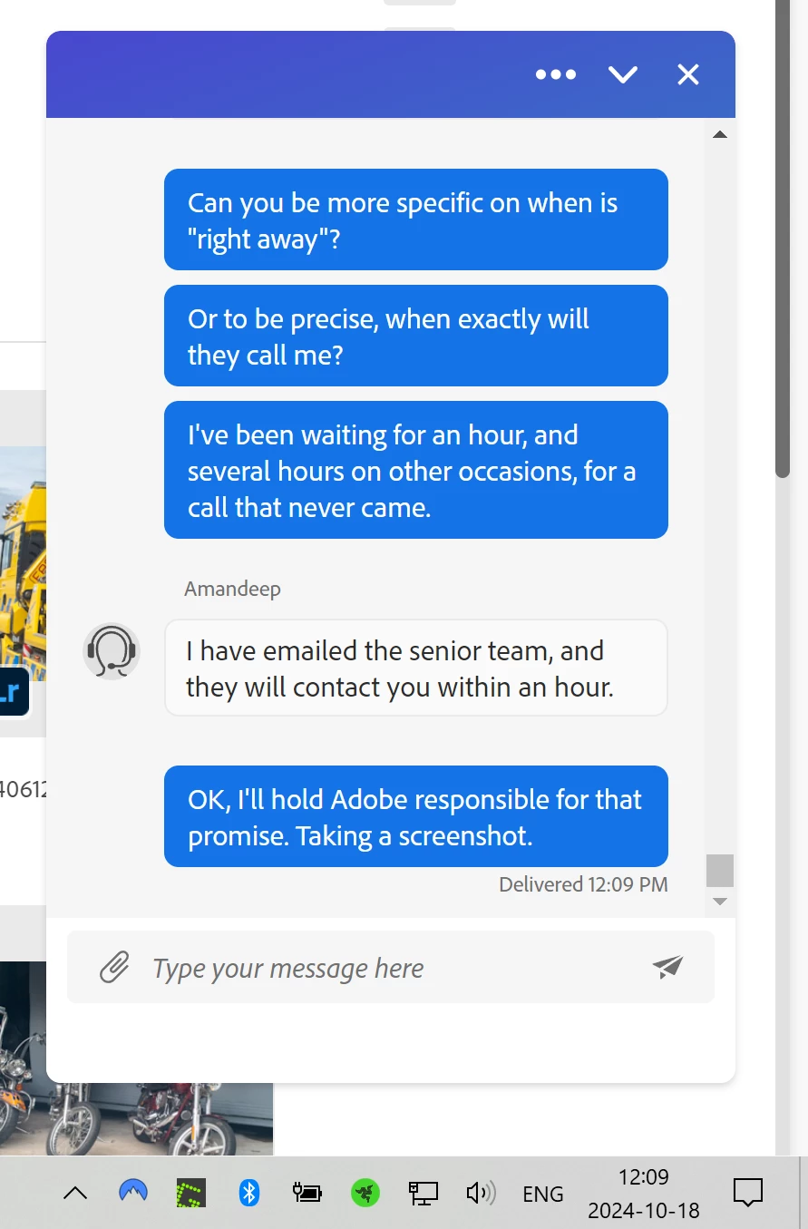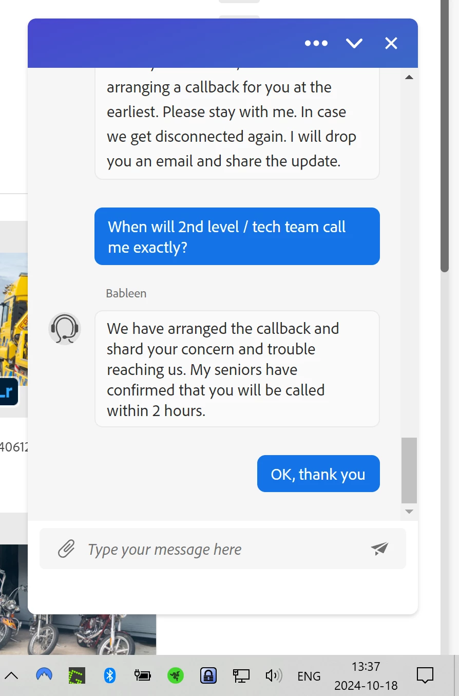 On a third occasion, the callback promise was kept, but I never received a confirmation of the time slot. When I was out for a walk, the 2nd-level agent promised to call back within fifteen minutes after I returned. I rushed home, updated Lightroom, and waited—nothing for over an hour. I contacted frontline support again, and they assured me I’d receive a callback within an hour. Yet again, no callback. Screenshots attached for reference.