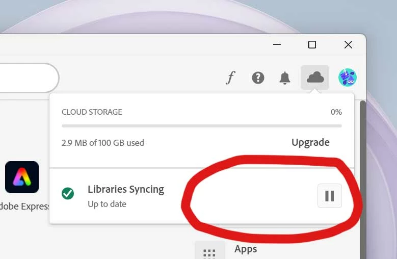 I also thought of going to Creative Cloud Desktop and messing with the prefrences in "cloud activity", but the preferences option (gear icon) is missing. (See 2nd screenshot.)