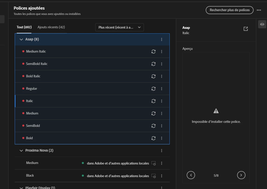 J'ai cette typo depuis quelques mois maintenant, et je n'ai jamais rencontré de souci jusqu'à aujourd'hui. J'ai désinstallé Creative Cloud, je me suis déconnecté de mon compte, j'ai supprimé la typo, remis la typo mais rien n'y fait. Quand j'ouvre un de mes projets avec la typo qui s'y trouve, cela me dit que la police n'est pas présente...