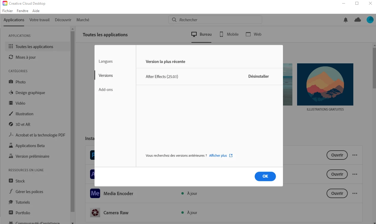 Bonjour, je n'ai aucune version 2024 disponible sur Creative Cloud (tout est déjà 2025 !) alors que je dois absolument pouvoir télécharger la version 2024 pour être compatible avec le studio avec lequel je travaille. Je n'ai que la version 2025 disponible et téléchargée, comment retrouver la version 2024 ? Le petit lien "Afficher plus" (cf photo) me renvoie sans cesse au site Adobe sans jamais me proposer les anciennes versions.