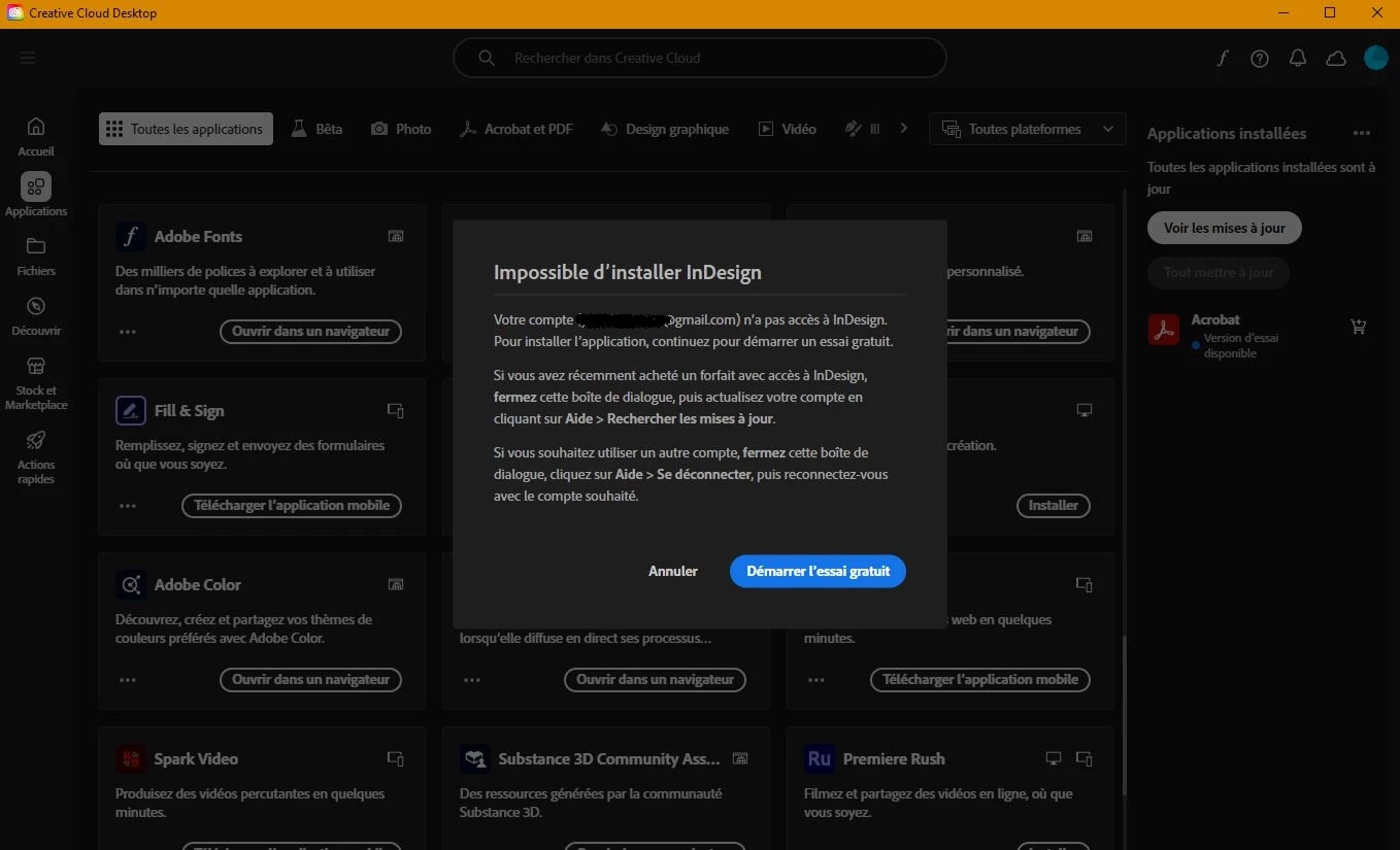 Cependant je ne trouve pas comment installer les logiciels (illustrator, indesign, photoshop) sans mettre mes codes de CB pour une version d'essai alors que je suis censé avoir déjà un accès pour les deux ans à venir. J'ai trouvé péniblement des liens de téléchargement, et après avoir installer creative cloud, cela ne fonctionne toujours pas, pour exemple le message d'erreur que j'ai eu lorsque j'ai essayé d'installer indesign en pièce jointe.