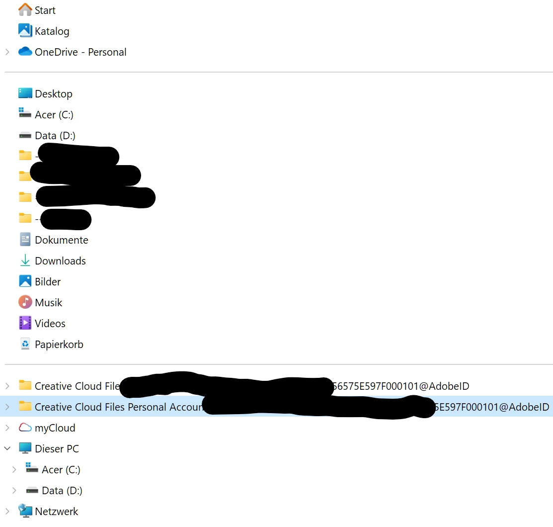Ich nerve mich seit Wochen über das Chaos, welches die Cloud-File-Synchronisation (welche ich nie verwendet hab) bei mir im Win11 Explorer hinterlassen hat. Das Problem ist simpel: Ich habe seit einigen Wochen zwei persönliche und generische "Cloud-File"-Verknüpfungen im unteren(!) Teil der Explorer-Seitenleiste. Es geht also NICHT um die Entfernung des Haupt-Links ("Creative Cloud Files") im oberen Teil. Dies ist längst weg (und ich kenne das Thema der eingestellten Dienste, by the way. Da ich es aufgeräumt mag, möchte ich diese beiden Folders weghaben, aber der obere Link erzeugt eine Fehlermeldung (Pfad nicht vorhanden), der untere Link führt zu einem leeren Ordner.