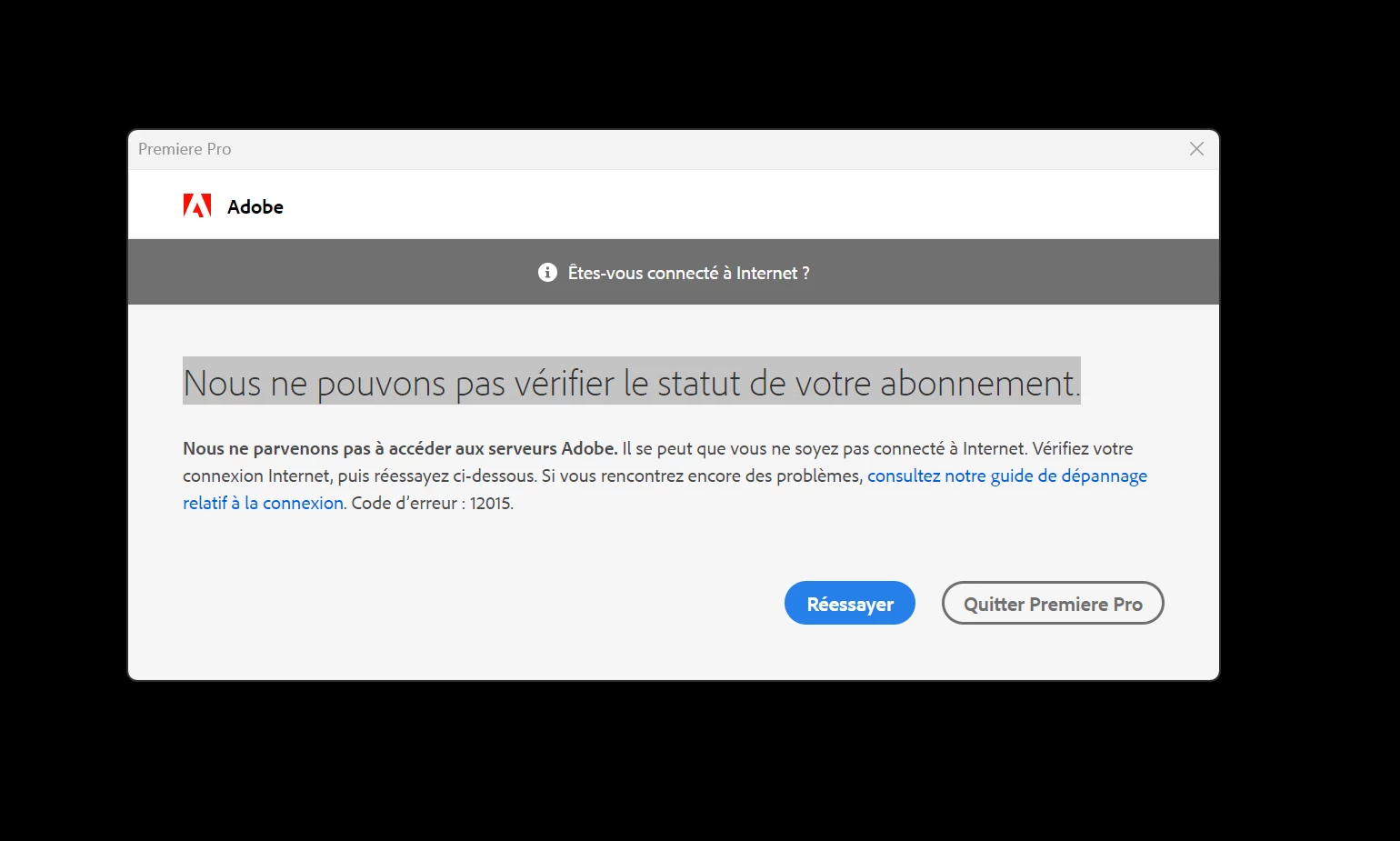 Bonjour je viens de souscrire a l'abonnement adobe premiere seulement probleme lors du lancement via creative cloud erreur 12015