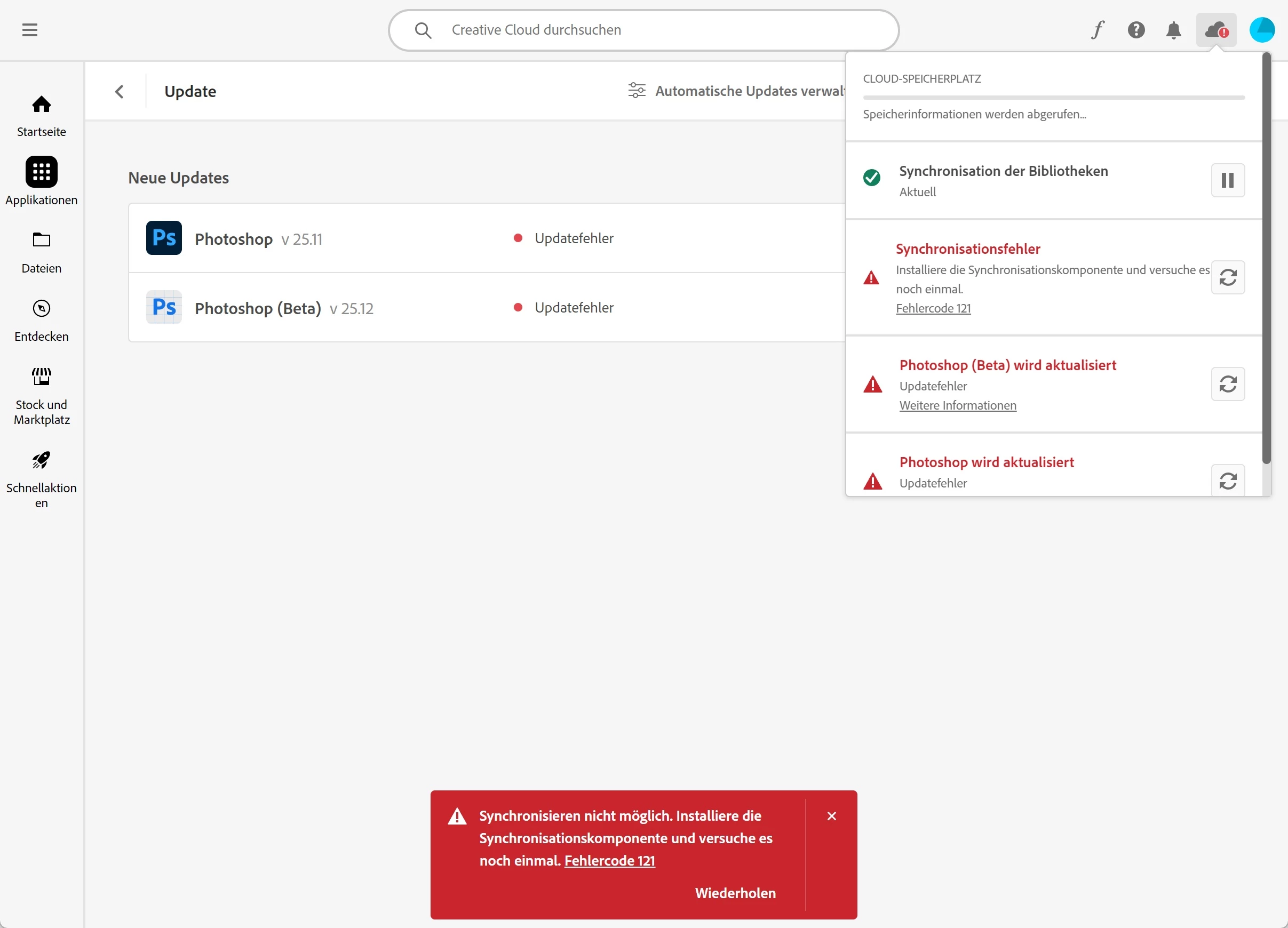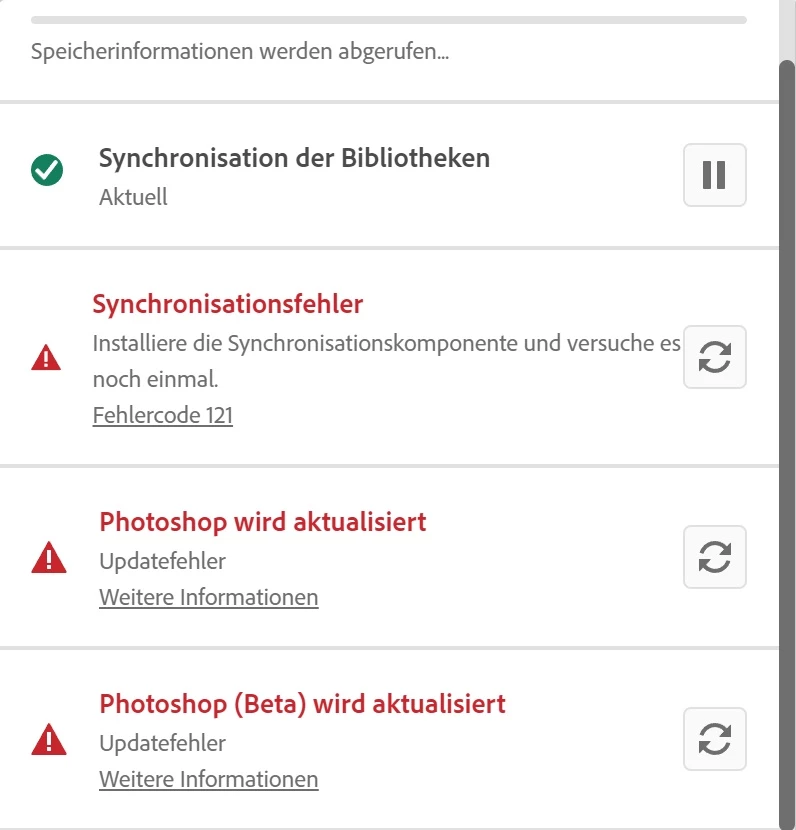 Seit ein paar Tagen lassen sich Photoshop und Photoshop Beta auf beiden dafür verwendeten PCs nicht mehr aktualisieren. Die Aktualisierung bricht jedesmal bei 11% ab.
