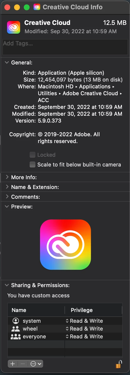 I rebooted the Mac again, verified the Adobe CC changes remained "Read & Write". When I launched the app, it did spin for 10-15 seconds, unfortunately, I'm still getting the access error.