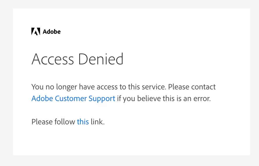 Access Denied You no longer have access to this service. Please contact Adobe Customer Support