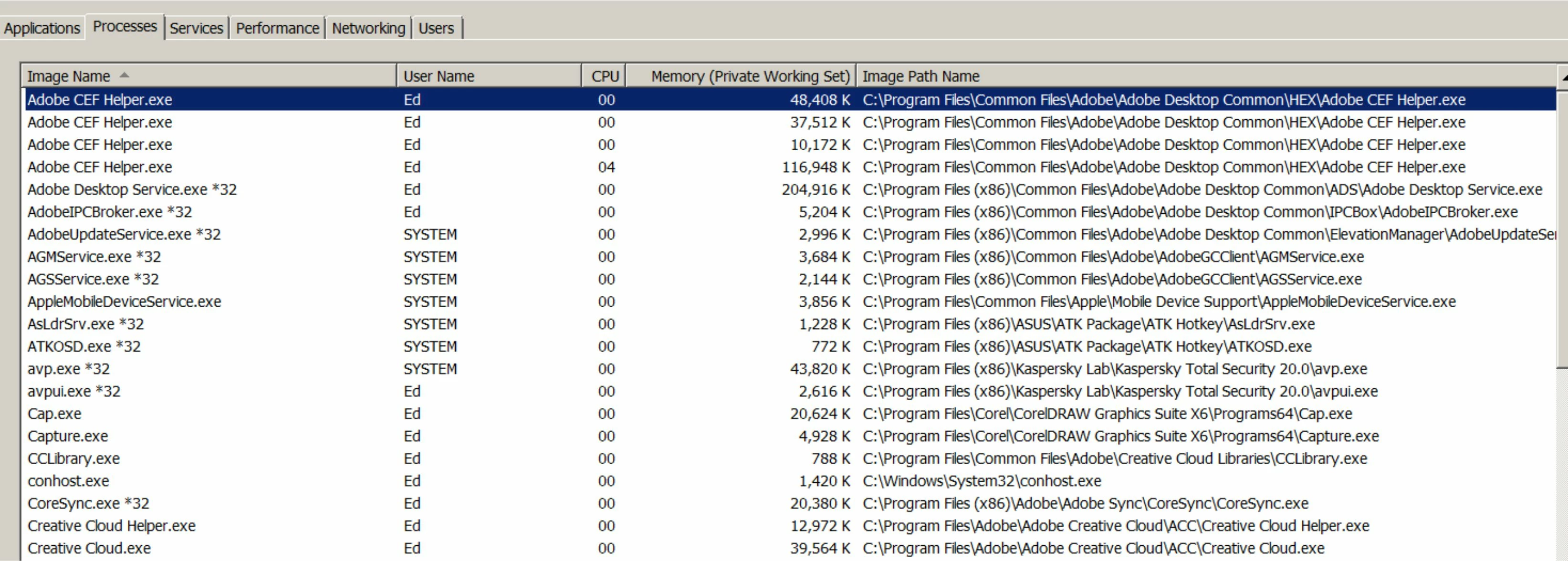 Why do so many of these processes need to run when nothing is active. I can understand how the process will start when I run Photoshop or Dreamweaver, but why don't they close when the program closes. These processes eat more memory than all the others that are running. Adobe Desktop eats 265,000 k. Just one instance of CEF Helper eats 116,000 k the other 3 eat 201,000k combined. Google searches show many posts but few solutions. One suggested the CEF Helper couldn't write to a log file and suggested a search into User/appdata/local/Adobe/Creative Cloud/log to see if the folder was there. It's not. There is no Creative Cloud folder under Adobe in appdata/local.