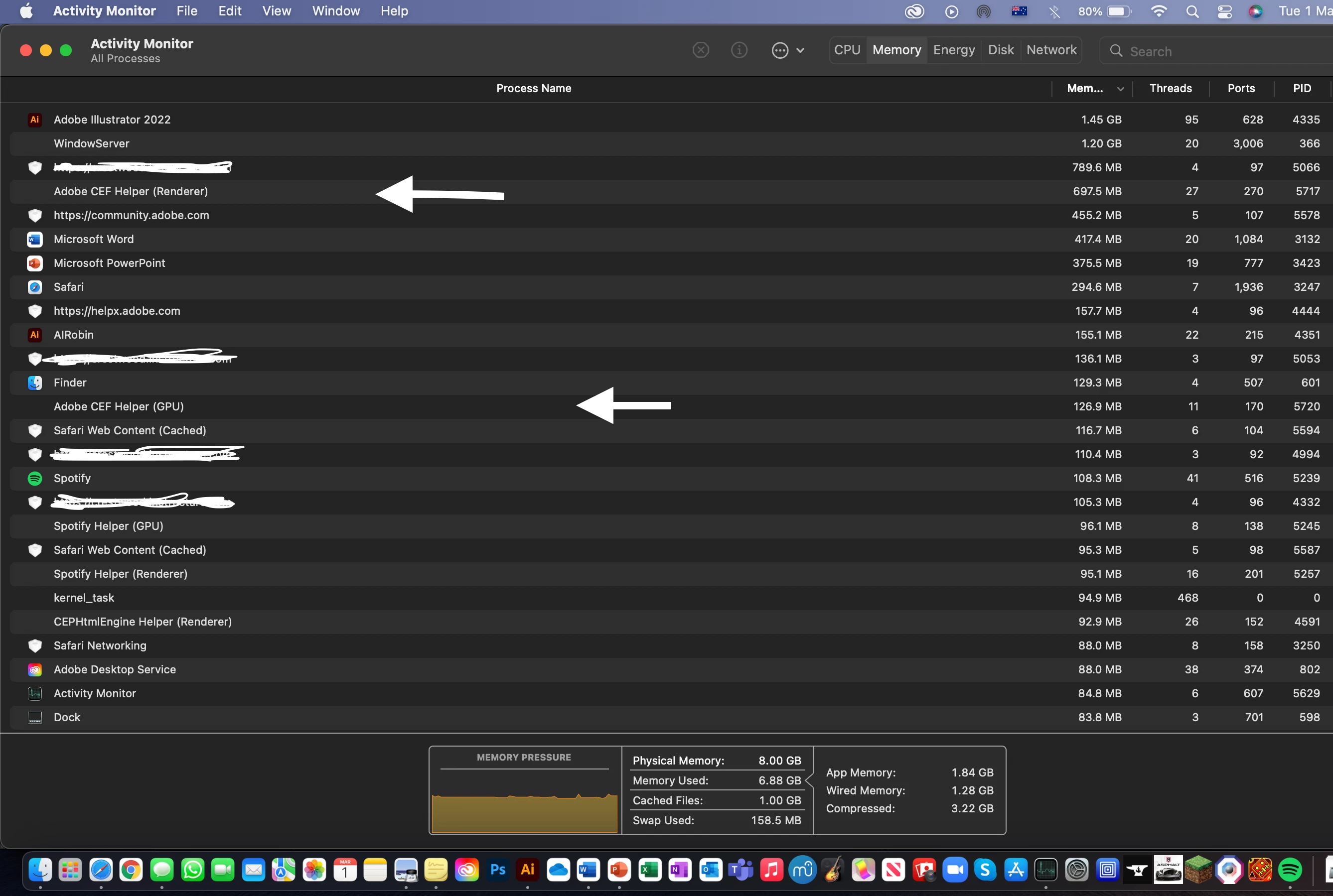 I have recently purchased an M1 based Macbook Air 8gb. I installed creative cloud, and after a few days, I have noticed my memory pressure was constantly sitting at either orange or red, and at times my laptop slows down so much I have to restart it. After going into activity monitor, I saw Adobe CEF Helper (GPU) and Adobe CEF Helper (Renderer) constantly taking up 200-400 mb of RAM each. That is quite a lot considering the amount of other applications I have open. None of them are taking up any CPU though (0.1% each), and each time I force quit it, it reappears, but taking up even more memory (usually 1.2gb each), and then going back down to around 250mb.