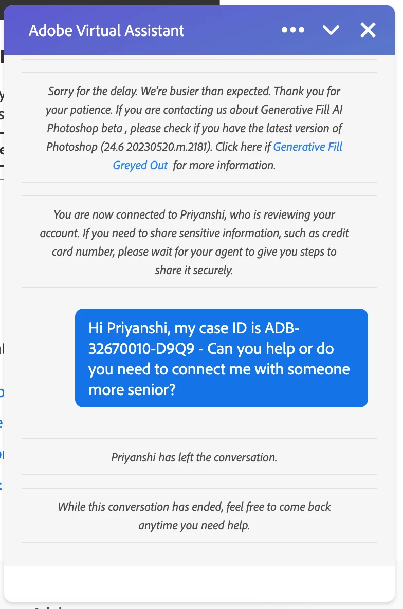 I'm incessantly reaching out to Adobe tech support multiple times a day across all platforms - chat, phone and now email (since they emailed me with a possible resolution which didn't work 48 hours ago). I seem to be stuck in an endless loop of chat support agents disconnecting, or transferring and disconnecting - "Agent name left the chat", or phone agents putting my case into the "too hard" basket and transferring me through an endless loop of phone agents. Today I was told on the phone that I would receive a call back from senior tech to finally help me resolve the issue, but I never received the call. I've also called the local Adobe office in my hometown and left messages on their automated voicemail.