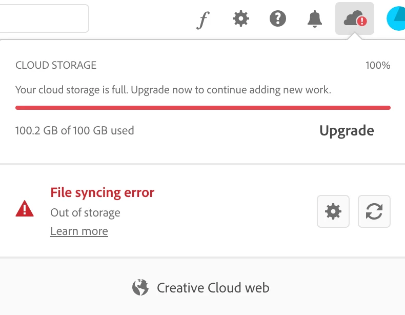 I have therefore moved a ton of Creative Cloud Files to my Dropbox where I know I have room. However, the Cloud storage warning has not changed, and I am still gettting syncing errors this morning (see screenshot). When I go here https://assets.adobe.com/files I see it still thinks some of the files are there. I hoped it would resolve the sync overnight but I am still out of luck.