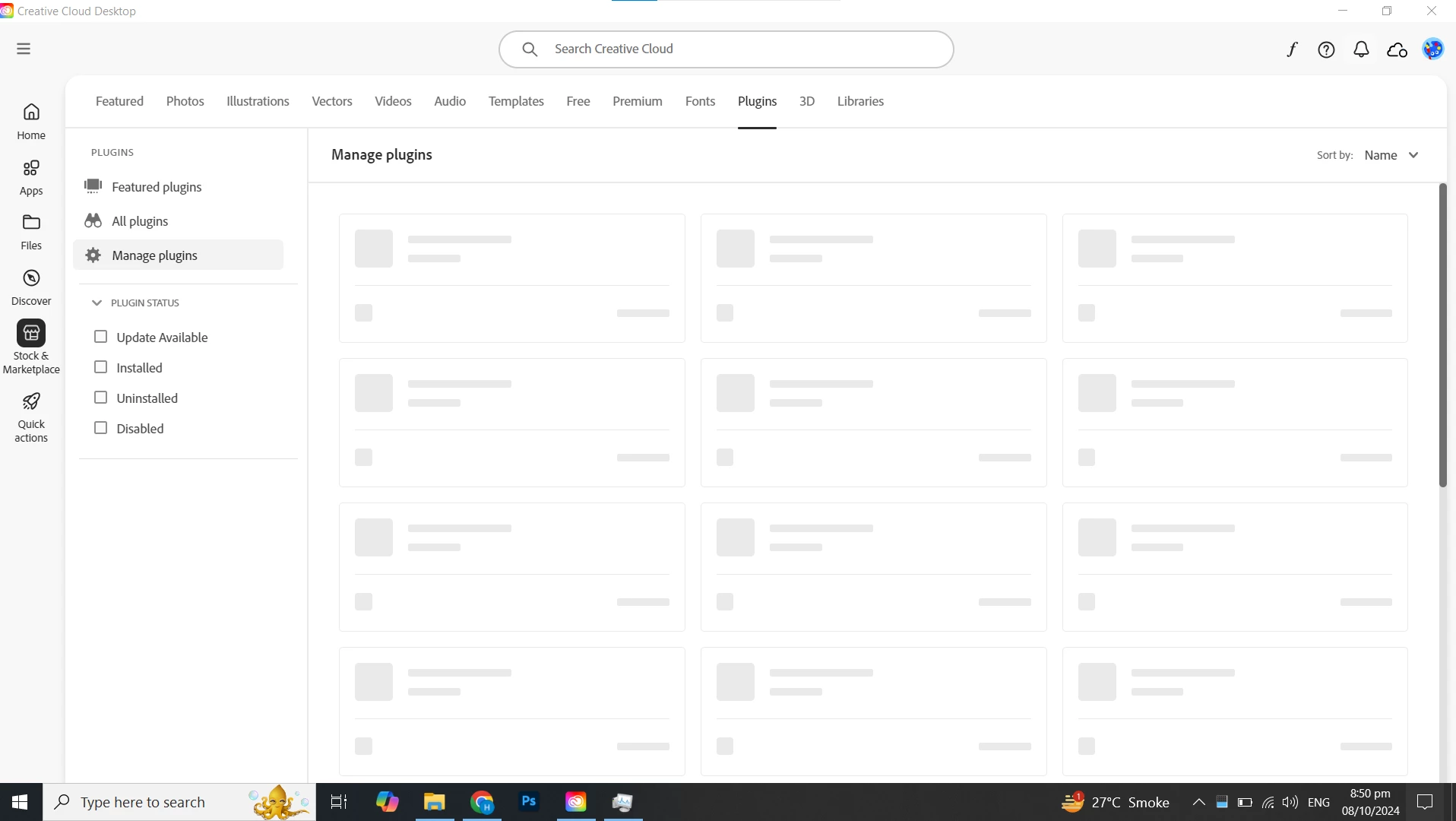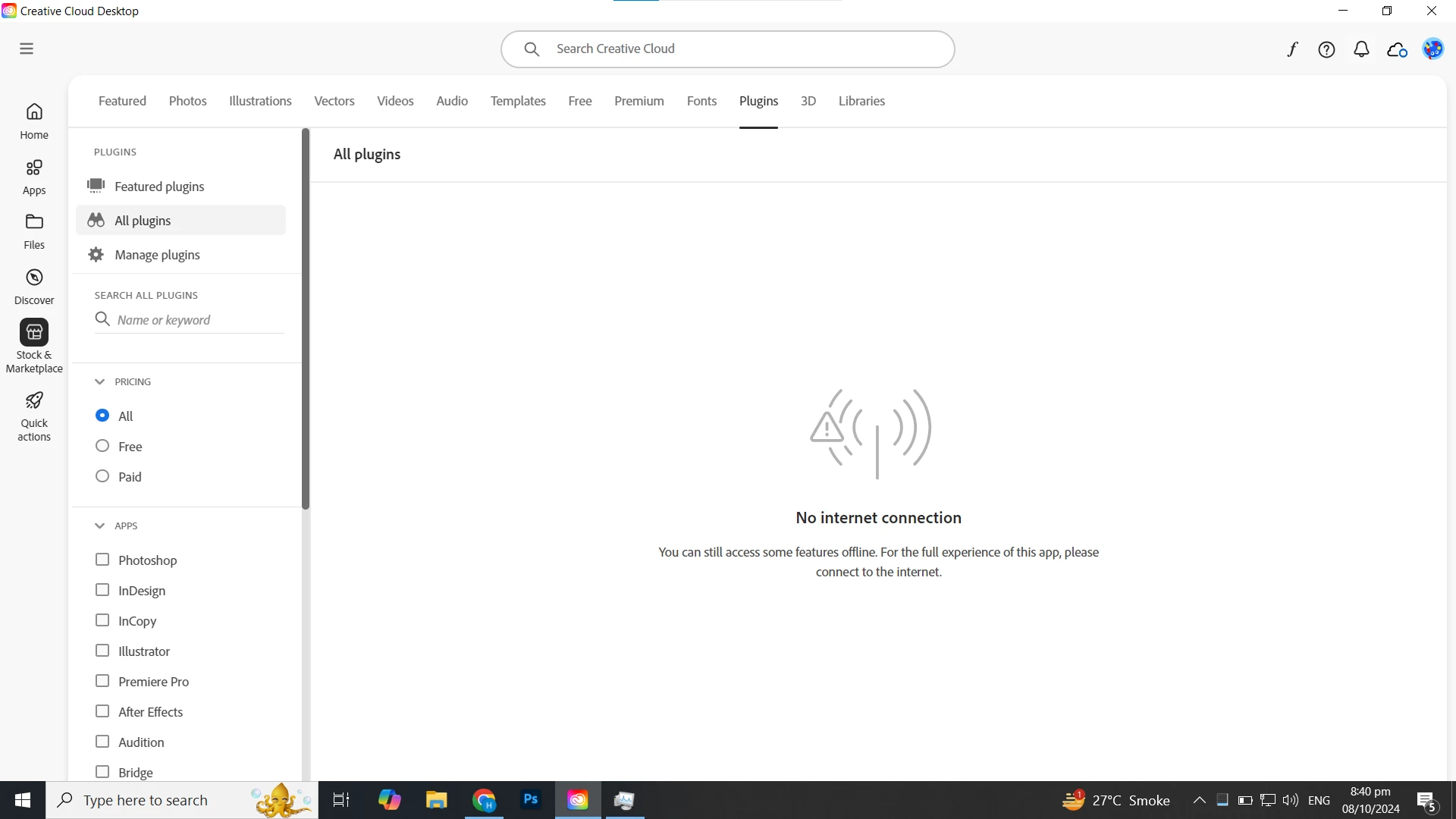my all plugins tab is not opening in adobe creative cloud and showing that you have not internet connection but my device has active internet connection and manage plugin tab not loading