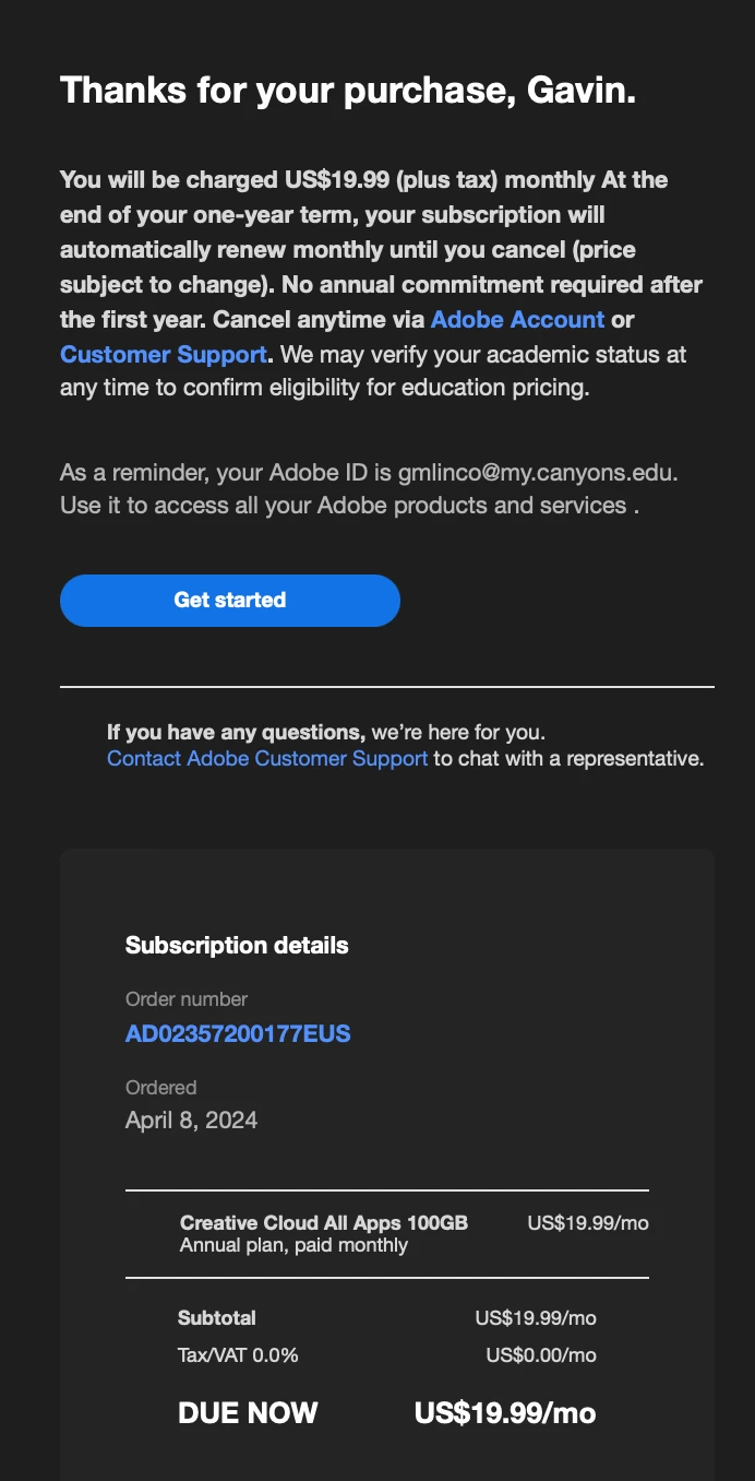 Hello, I recently purchased the $19.99 Creative Cloud subscription for all the software, I bought the Creative Cloud subscription and received an email from my school account. But then when I opened the software apps it said that my trial ended because a few months ago I bought the 6-month Adobe software from a website called https://store.collegebuys.org/. Is there a reason why my software wasn't relaunching when I first bought the discount for $19.99 Creative Cloud software apps? Also when I click my order number it says there are not any orders associated with my account. I'm not sure why.