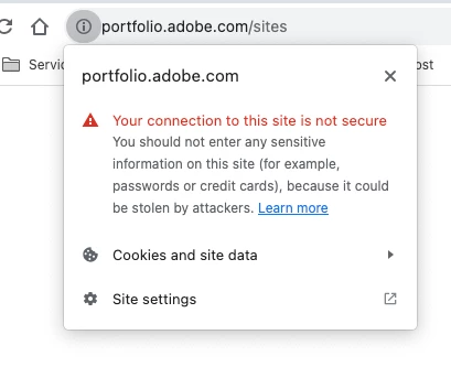Apologies if this is the wrong place to post this. I have been tryting to open Adobe Portfolio in browser and the page stays blank using Firefox, Safari and Chrome. Then with Chrome I get this messages.