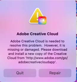 I get this message everytime I start my computer and it take two to three hours to finally fix sometime I have to do it twice to get it to work. I have uninstalled the creative cloud app several times but it doesn't work, I still get the message. Makes me want to stop using Adobe as there is no place to ask them direcrtly here is the message