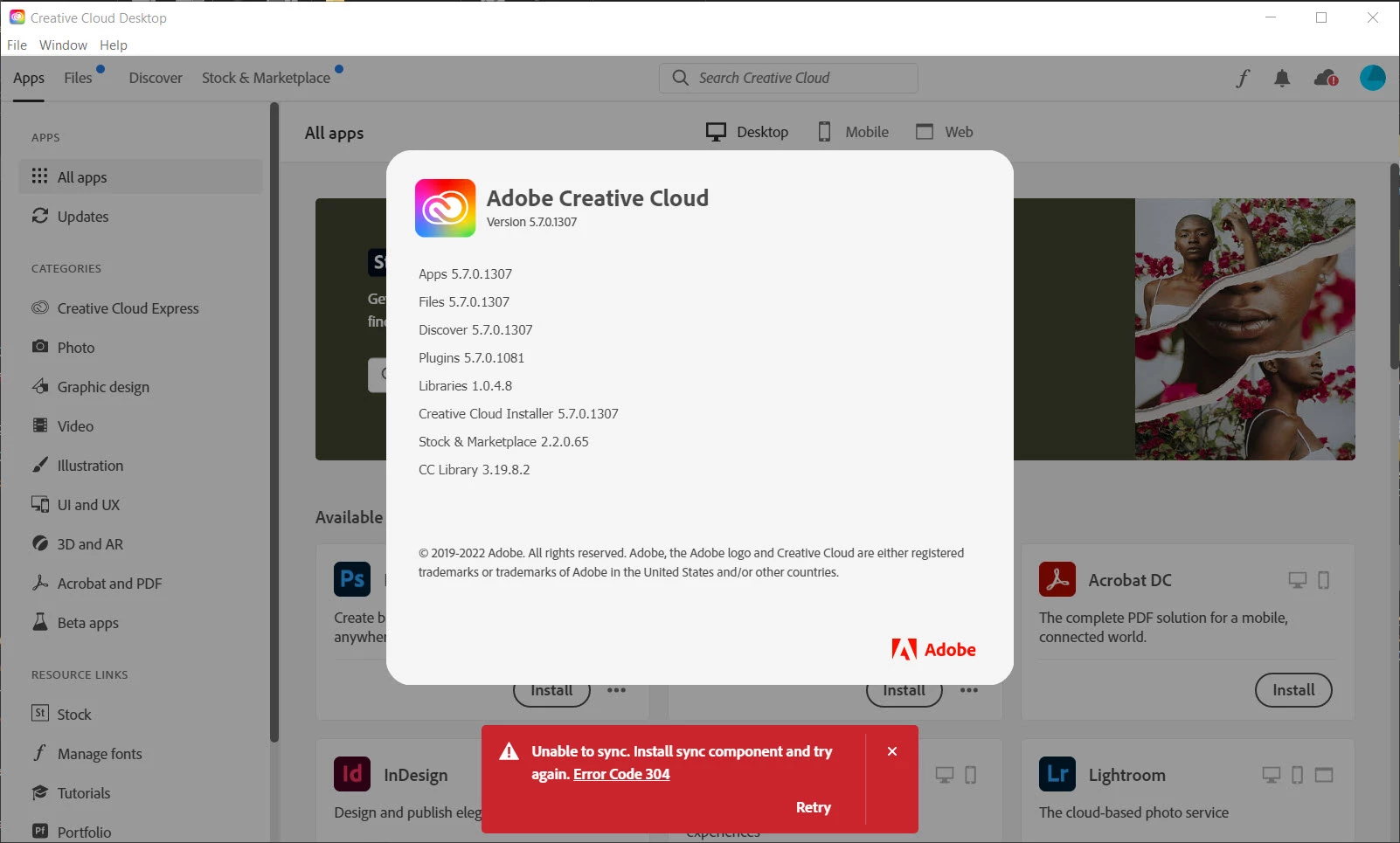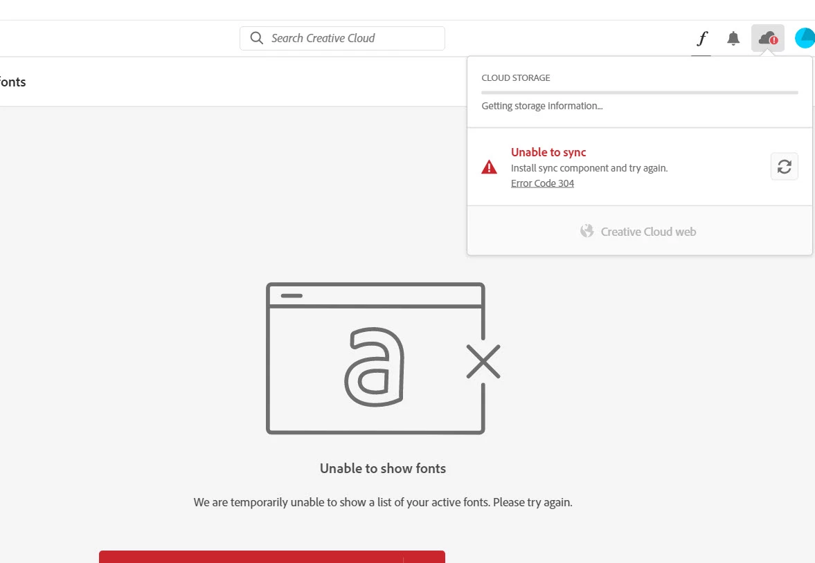 AdobeCC Unable to sync. Install sync component and try again. Error Code 304