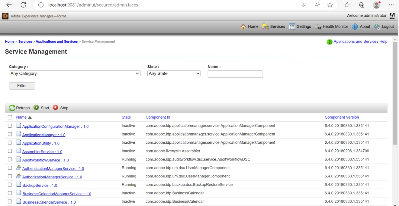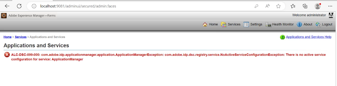 ALC-DSC-099-000: com.adobe.idp.applicationmanager.application.ApplicationManagerException: com.adobe.idp.dsc.registry.service.NoActiveServiceConfigurationException: There is no active service configuration for service: ApplicationManager