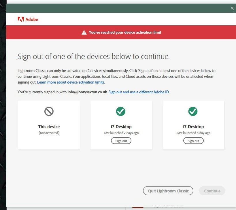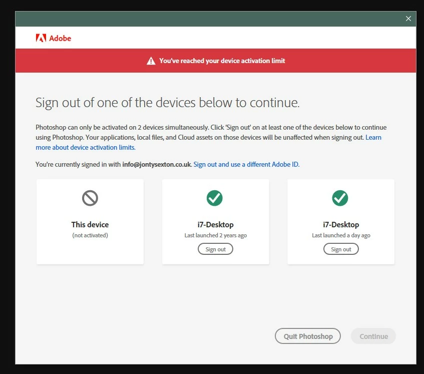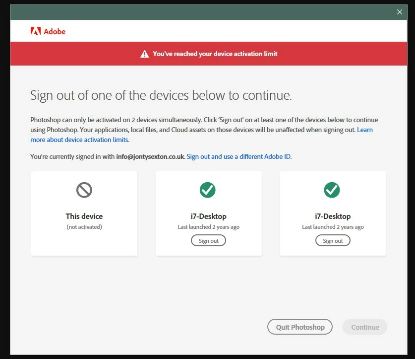 Then I received the Activation Limit warning - although both PCs listed are the same PC I'm trying to log in with. It says last launched 2 years ago! Strange, because I've been using these apps fairly solidly for the past 2 years. I cleared the activated computers via my account settings.