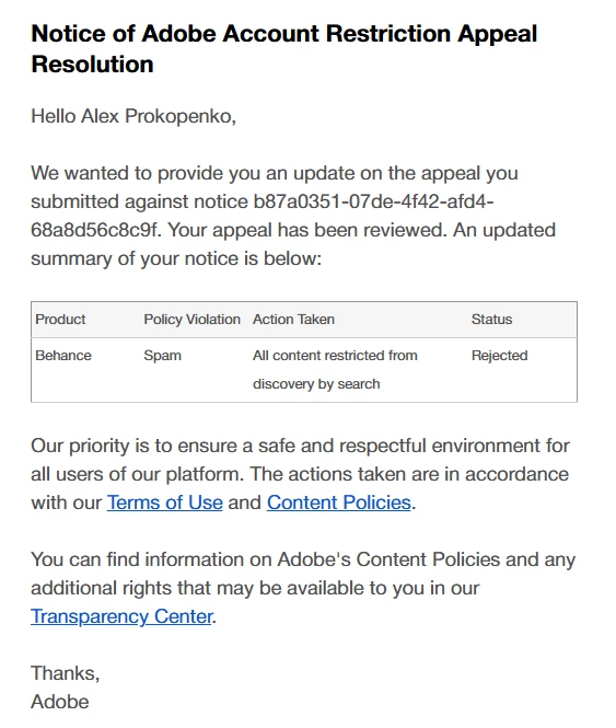 Hello Behance Team, My account was banned for "Spam", and my initial appeal was rejected. Please help me to solve this problem. I did`t even sent any message last month to someone and did`t comment any post last 3 month.