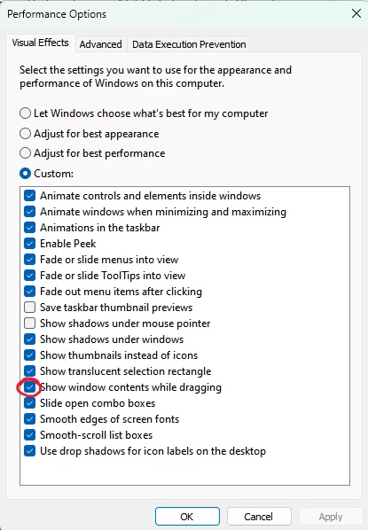 Recently I was looking to optimise the performance of my computer and came across a frustrating glitch that I wanted to bring to people's attention. In Windows 11, if you open up "System Properties" > "Advanced" > "Performance" > "Settings", and under the "Visual Effects" tab there is a setting that locks Adobe program windows to their position on the screen in error. If you have the setting "Show window contents while dragging" unchecked, it will lock the windows to whatever positions they are currently opened in or whatever position they start up in. You are able to resize, full screen, minimize, or "dock" if you have that setting enable on Windows 11, but you cannot drag the window around from where it's unexpectedly pinned. Hope this helps a few people.