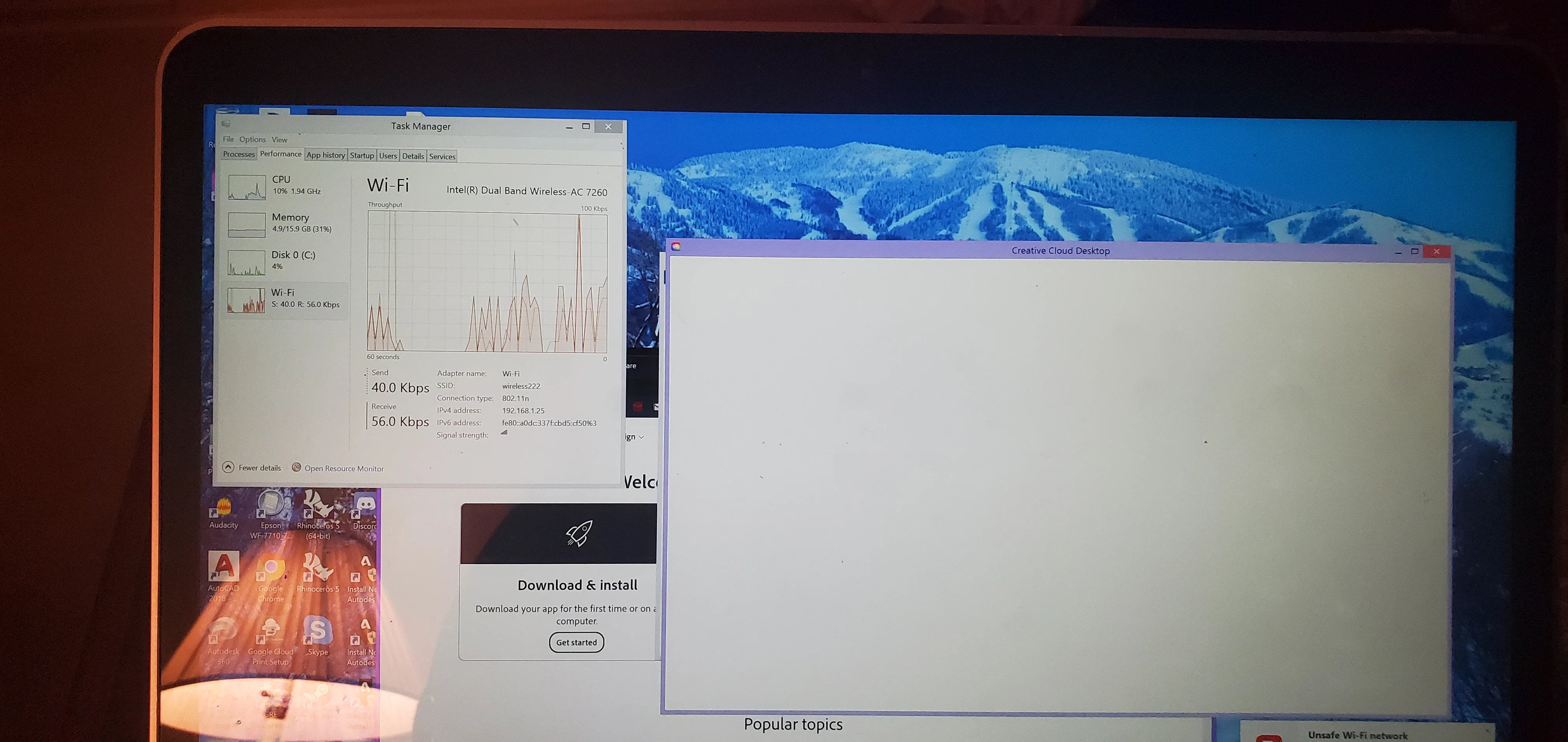 In task manager, it shows repeated random spikes in wifi usage, which I think it part of whats causing my active windows to blink in and out of use, even though adobe is only running in the background.