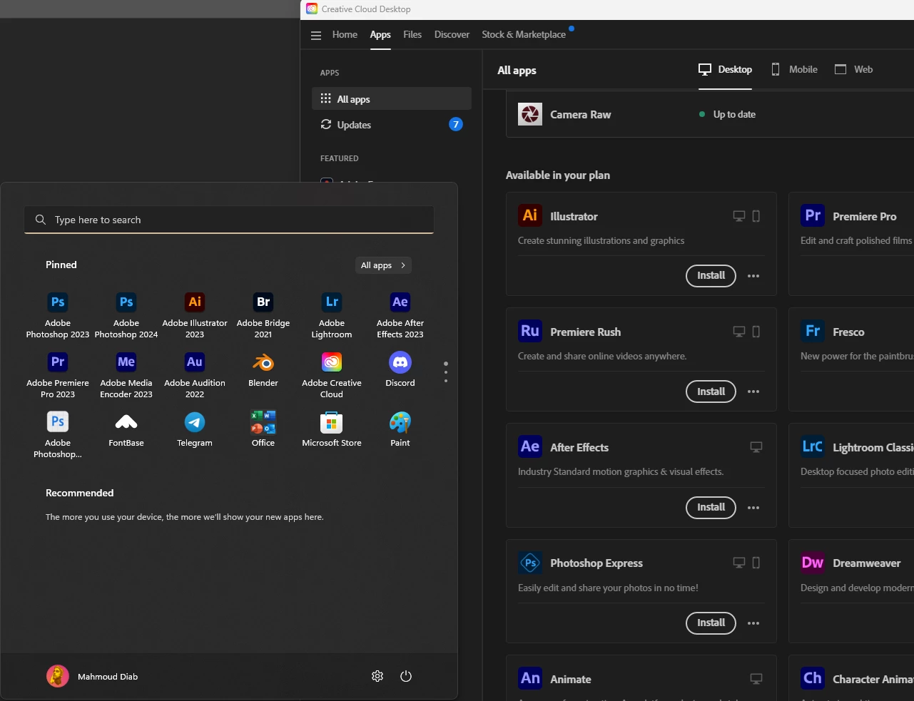 I'm using the latest Creative Cloud app and It's not showing the apps as installed ( Photoshop, Illustrator, Premiere Pro, After Effect ) in the installed apps, nor in the updates, I tried to install Photoshop so it might sync with the old preferences (plugins, scripts, and workspace) nothing happened as if it's installed as another new app