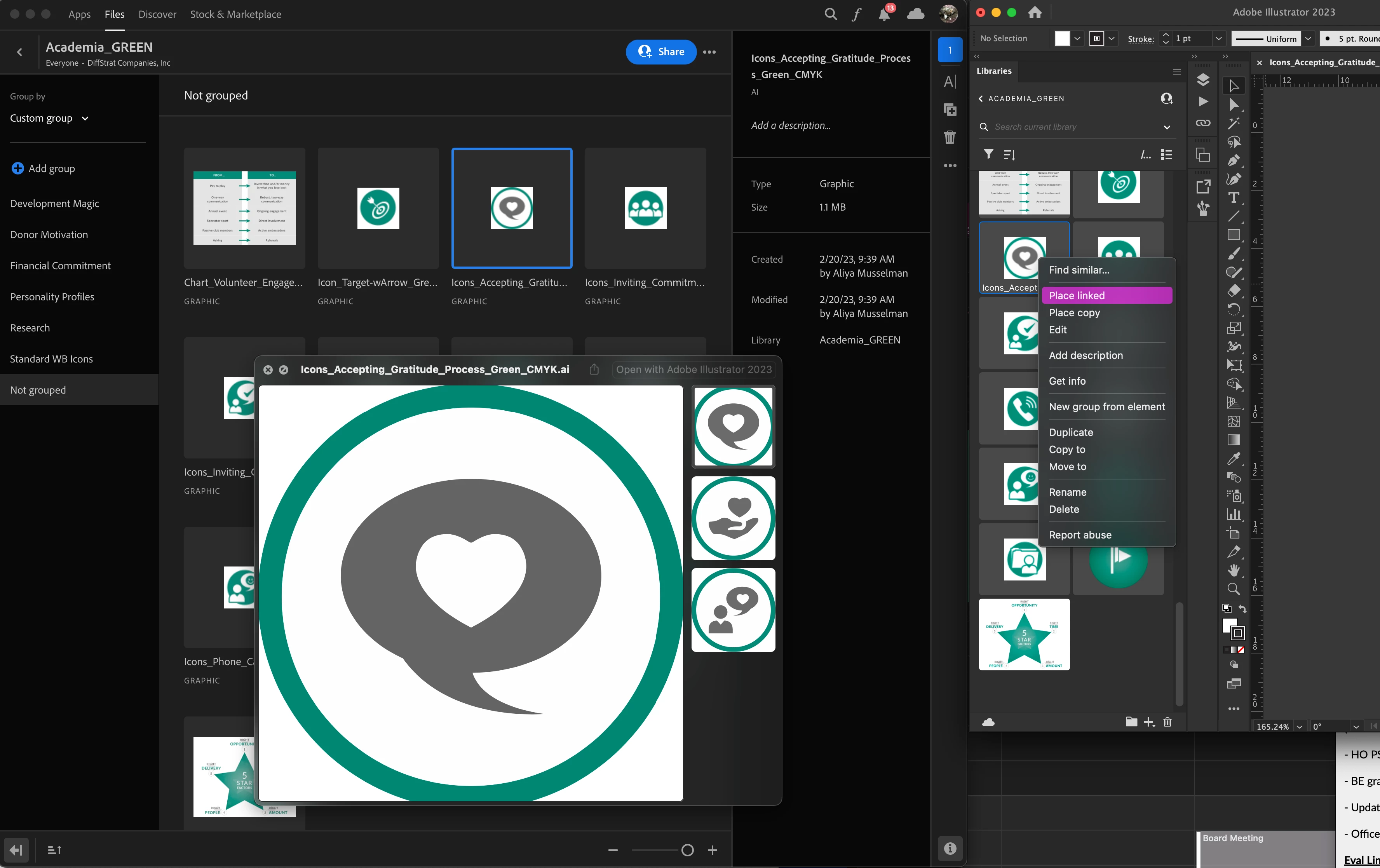 (Screenshot file shows the illustrator file in Finder quickview—it has three artboards. The same file is selected in Creative Cloud Libraries after its been uploaded. The other artboards are still there just not in the preview image in Creative Cloud Libraries. "Place linked..." in Illustrator does not bring a dialogue box up like "Place" from the main menu, and the default option is to place previewed image.)