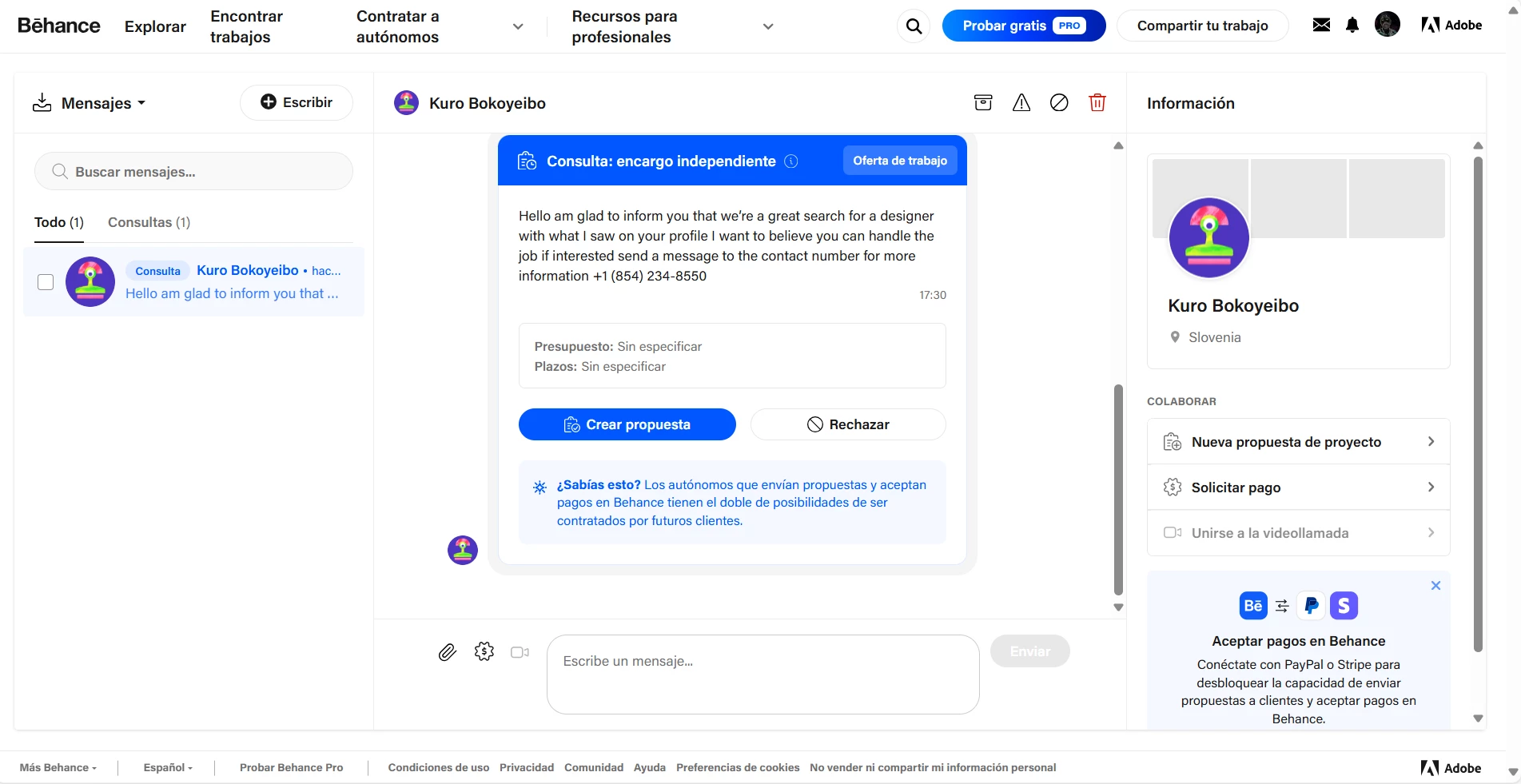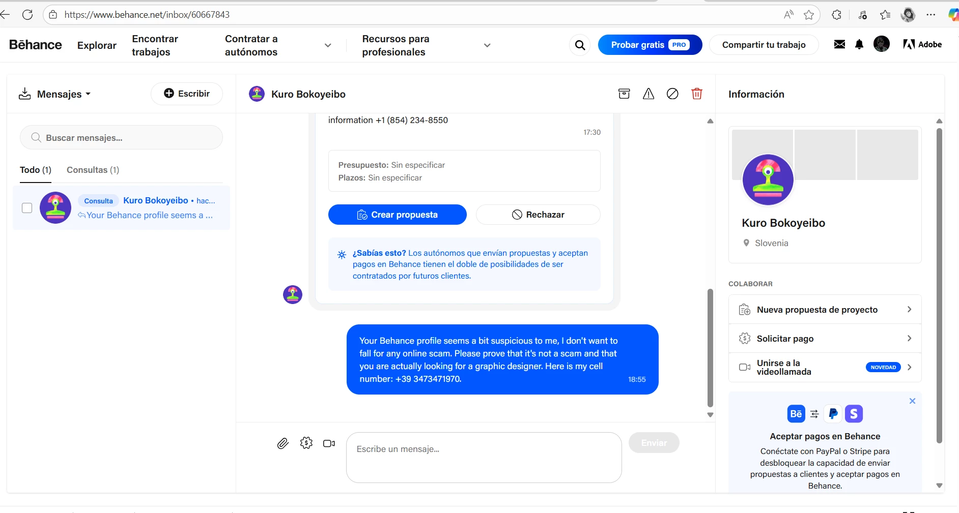 It has been nine days and he hasn't responded to the message, I also didn't write to the number he gave me; they are probably trying to scam me or hack my phone. I have already reported it to the Behance platform and I am also sharing it in this forum so that you are warned in case you receive any message from the same account or similar. (I used the translator to write, my mother tongue is Spanish)