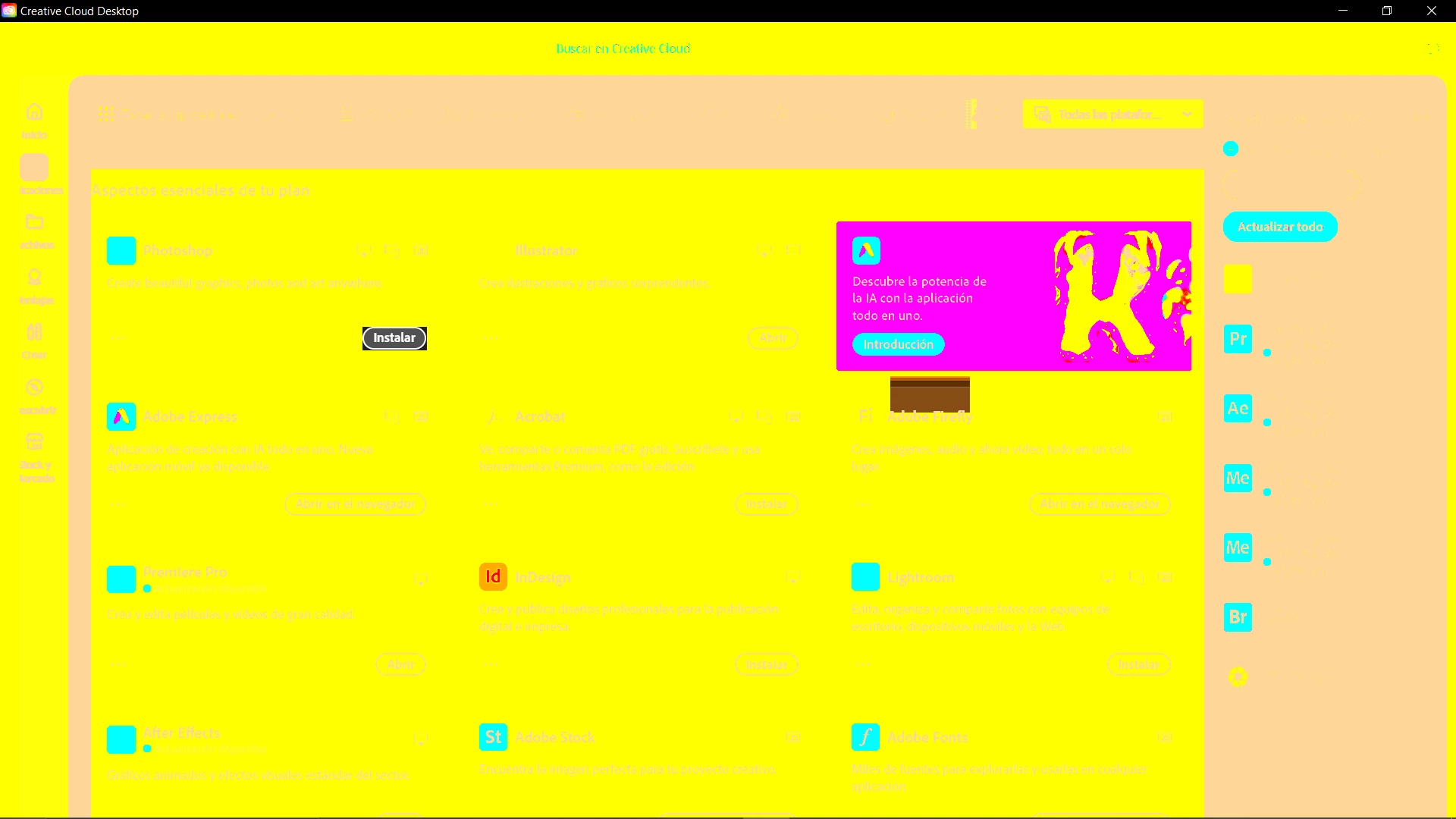 🔧 Estoy teniendo un fallo visual en Adobe Creative Cloud Desktop, se ve con los colores completamente distorsionados (adjunto captura). Además, cuando uso Photoshop y After Effects, los programas se demoran mucho al guardar archivos o al abrir proyectos.