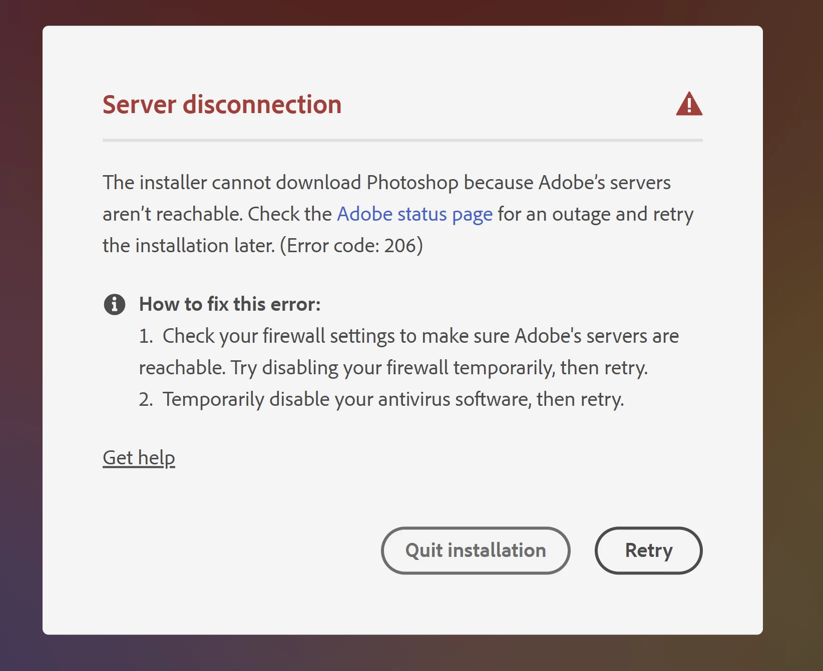I recently uninstalled Creative Cloud and all its associated apps (as they weren't working) using the official uninstaller and cleaner tool (https://helpx.adobe.com/creative-cloud/kb/cc-cleaner-tool-installation-problems.html) however I am unable to install my newly purchased Photoshop app as I keep getting a server connection error: