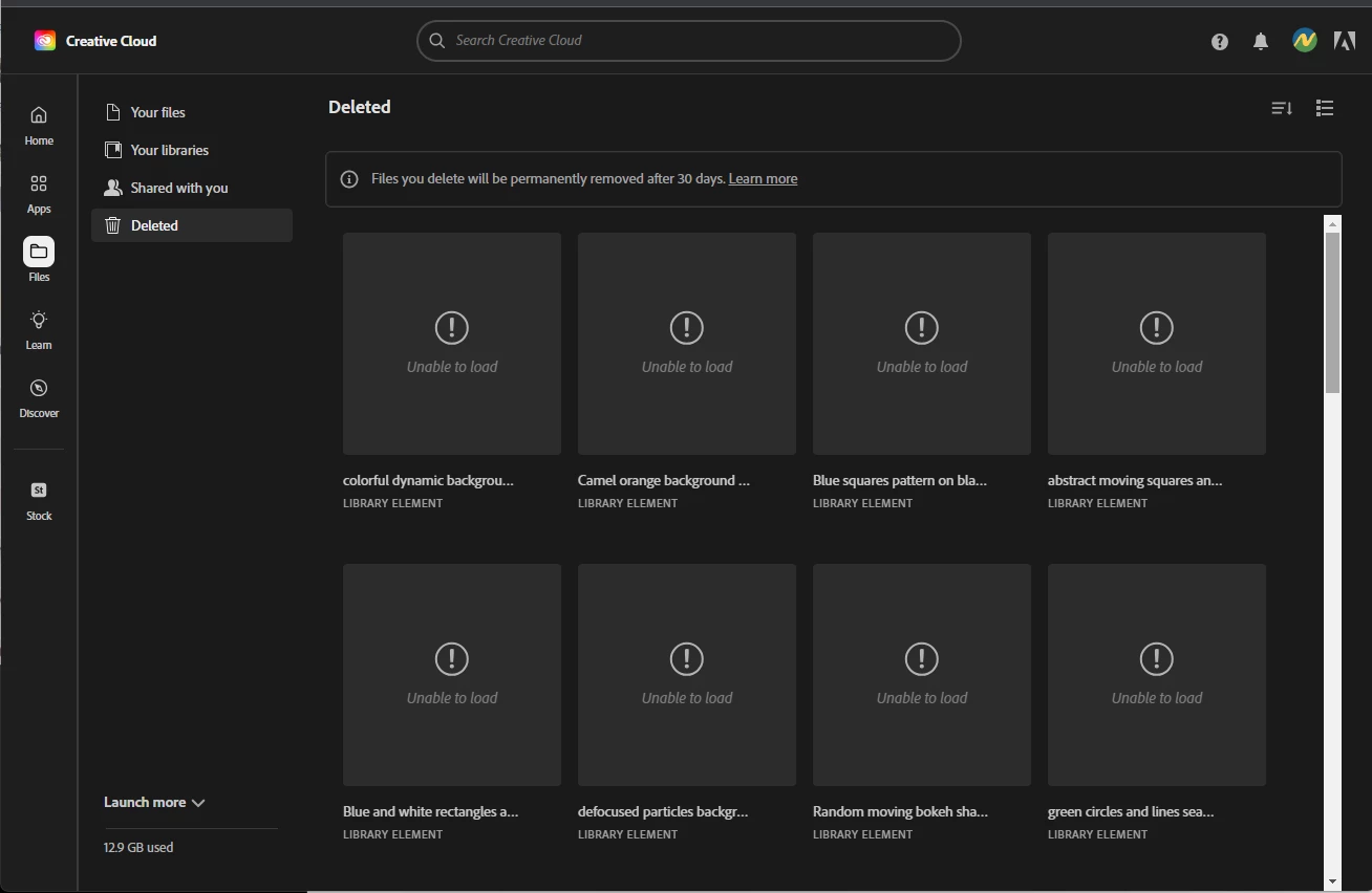 I'm trying to restore a file that I deleted from Adobe Creative Cloud, but it won't load the files. I've attached a screenshot. I'm using Windows 11 Pro Version 22H2.