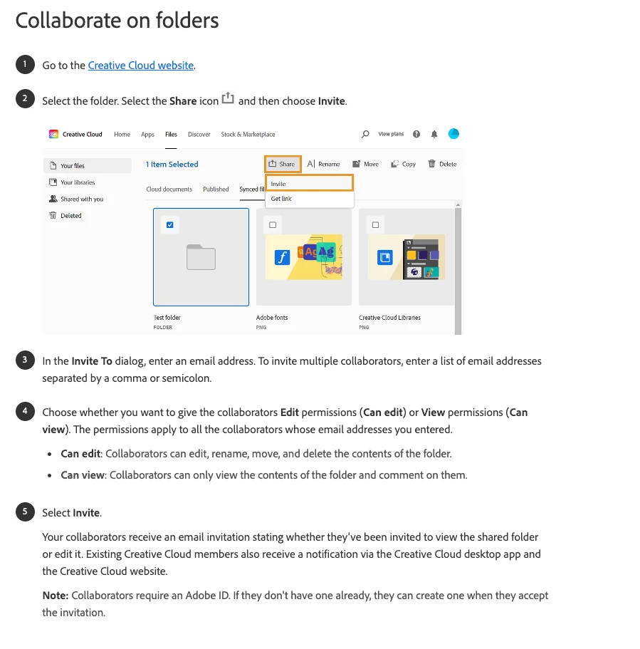 Jjessicaf1069577317593771Participating FrequentlyForum|Forum|1 year agoJuly 17, 2024QuestionCan't share folders in Cloud documentsForum|Forum|1 year agoJuly 17, 20241 reply176 viewsI found an article, attached, that says that this is possible: to share folders in creative cloud documents. But when I select the folder, this option does not exist. Is this a bug or something I need to talk to my admin about?Collaboration