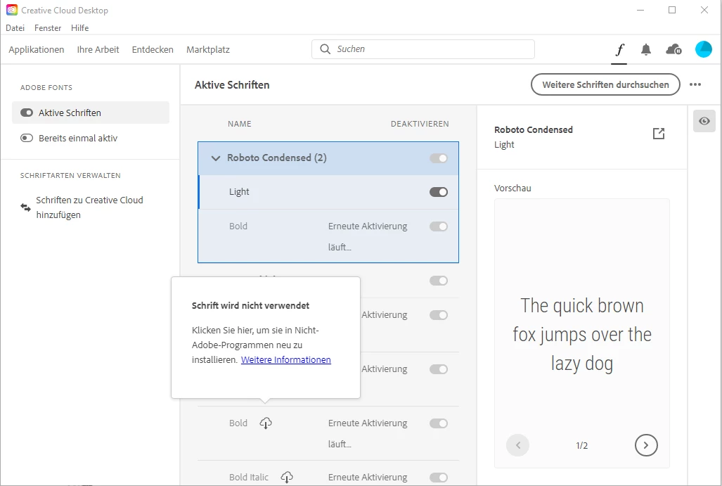 Logging out and in to the Creative Cloud Desktop App will not help. Also a restart of my machine will not help. I have no idea how long this issue already persists. I rarely use Adobe Fonts. Can only tell that I see this issue for about a week or so.