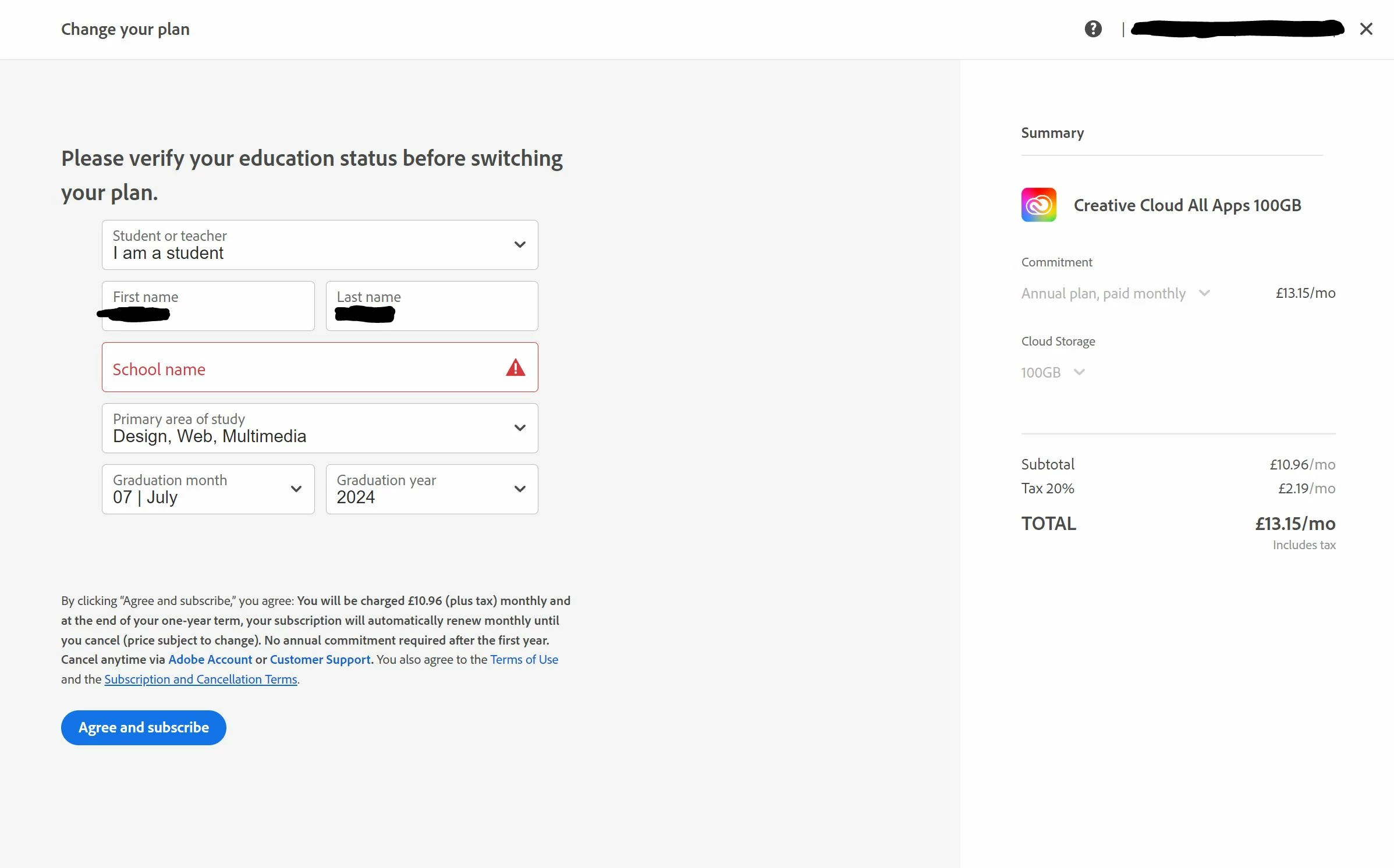 Last year on black Friday I bought the CC student plan at a reduced cost. Now it is black Friday again I wanted to buy it again. In my account it says I can do this, however when I press 'continue to verification' I am unable to type my university and there is no drop down. It simply goes red and I cannot type.