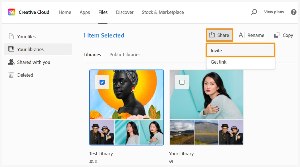 I have included a screenshot showing the invite option on the left and then the new library that doesn't have this option.